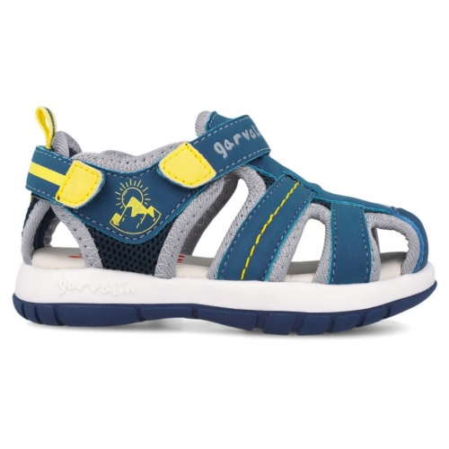 Sandalias para niños de color azul con detalles combinados en amarillo. Este diseño tipo cangrejera tiene puntera reforzada para que el pie quede totalmente protegido. Con suela gruesa de goma blanca para conseguir un look más sport.