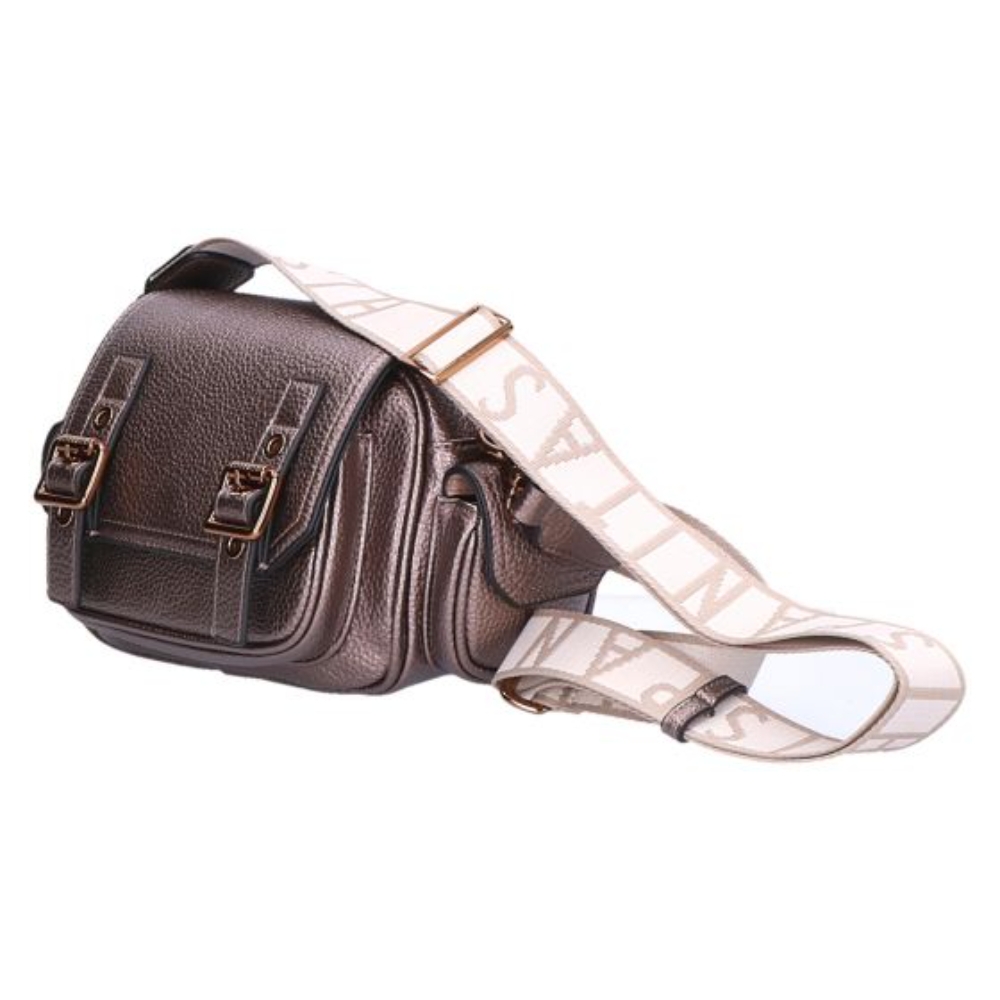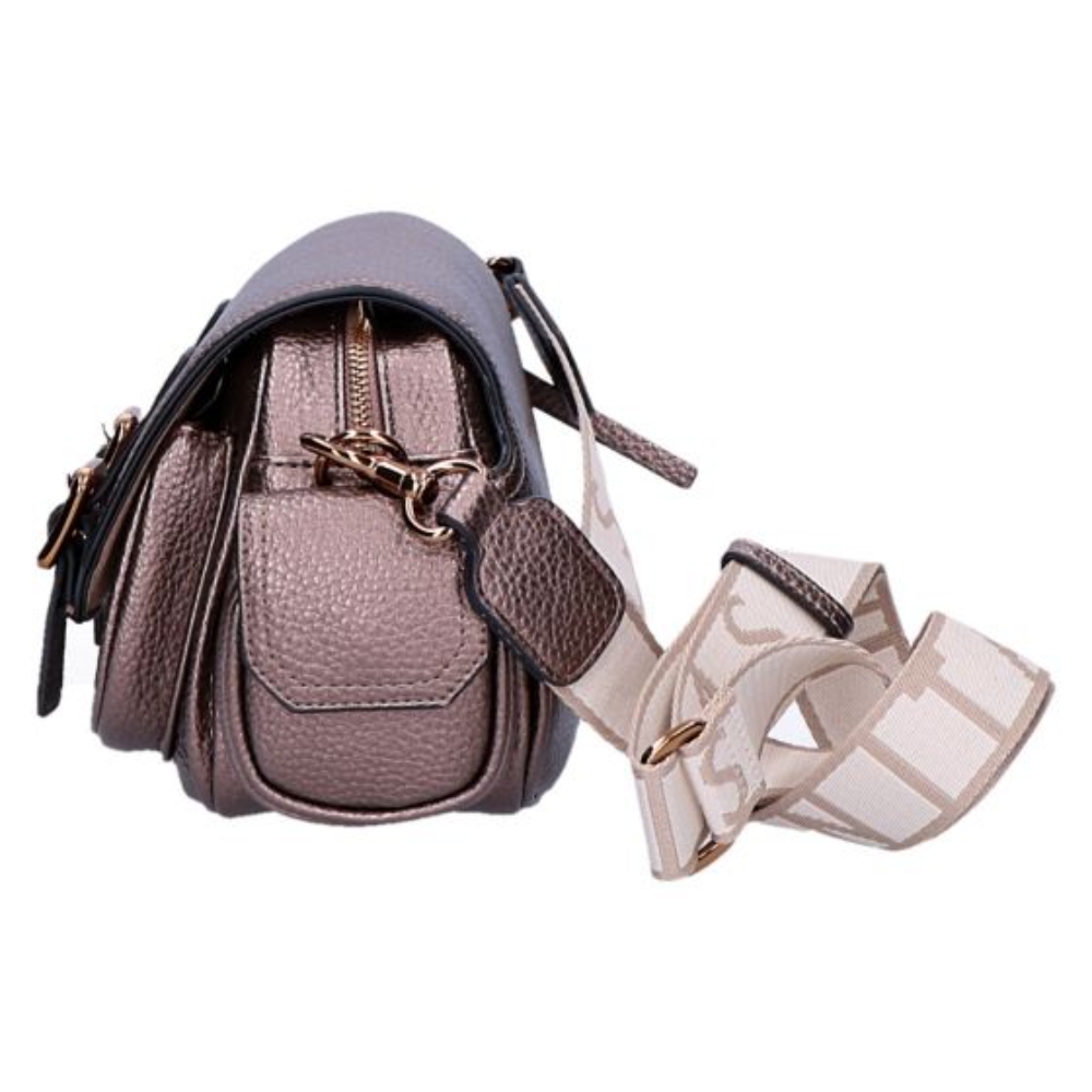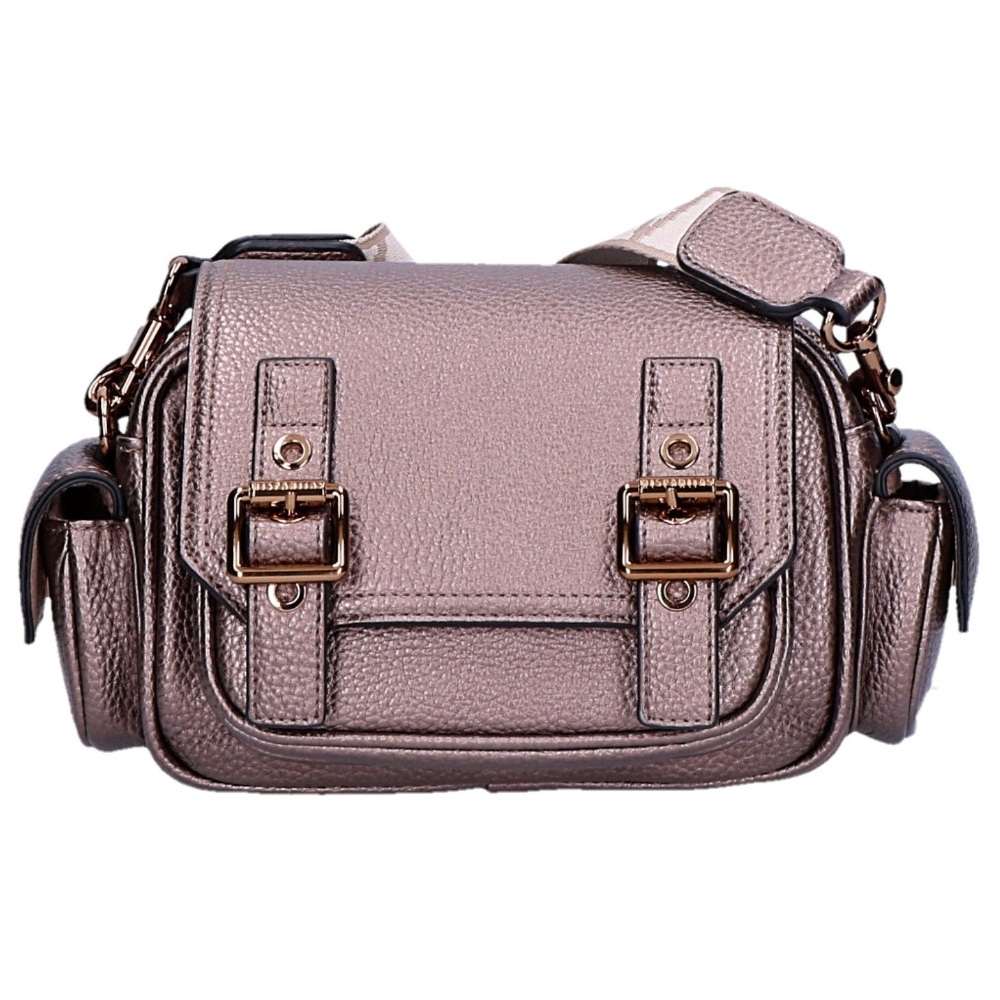 Bolso estilo bandolera con bolsillos laterales y cierre con hebillas y cremallera. Color topo