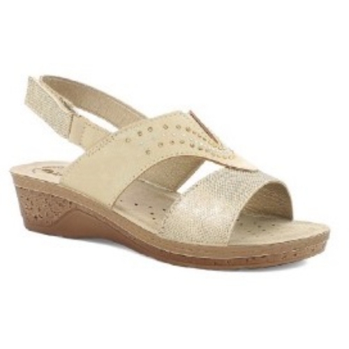 Sandalia con cuña baja para mujer. Fabricada en material sintético con plantilla de piel tipo bio ideal para los días más calurosos. Color platino