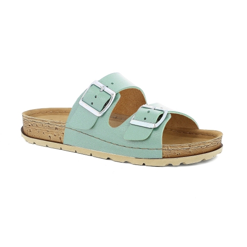Sandalia destalonada con hebillas para mujer. Fabricada en material de gran calidad con plantilla de piel auténtica transpirable. Color verde