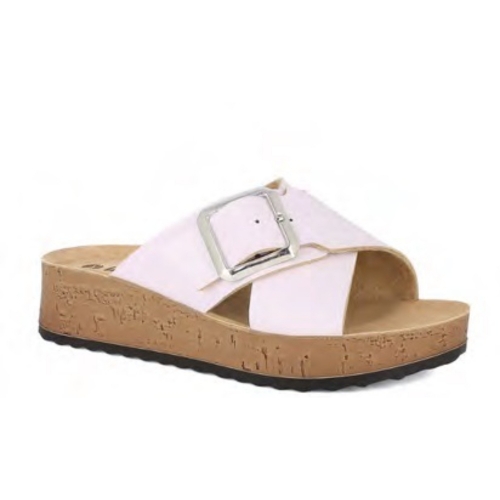 Sandalia con plantilla acolchada y suela muy ligera. La parte superior que envuelve el pie está forrada con material sostenible suave que proviene de botellas de plástico recicladas.  Color lila.