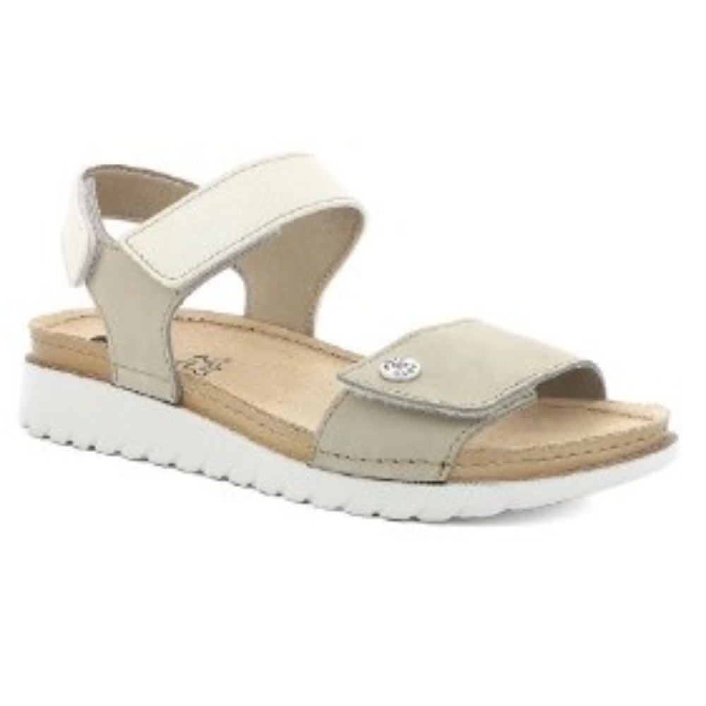 Sandalia confort de piel para mujer. Fabricada con materiales de gran calidad y plantilla de piel tipo bio para una mejor pisada y absorción del sudor. Sus velcros hacen de ella un ajuste total para cada pie. Color hielo