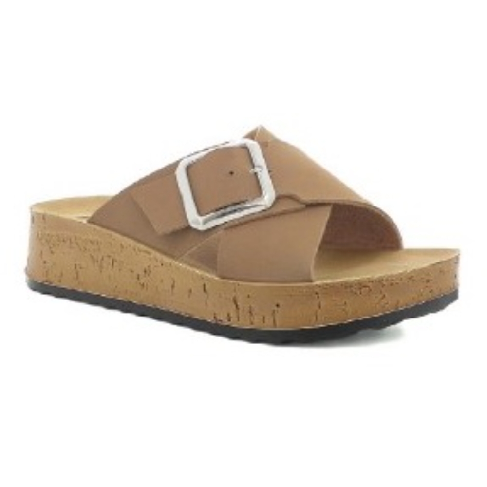 Zueco destalonado con cuña baja y tiras cruzadas en el empeine. Su hebilla aporta un mejor ajuste. Plantilla tipo bio acolchada para una mayor comodidad en cada pisada