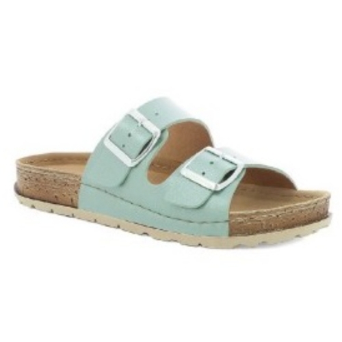 Sandalia destalonada con hebillas para mujer. Fabricada en material sintético con plantilla de piel tipo bio. Color verde