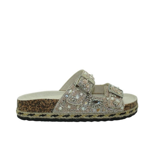 Sandalia destalonada con hebillas y pedreria de la marca Isteria para mujer. Fabricado en material estilo bio, ideal para los días mas veraniegos. Color crema