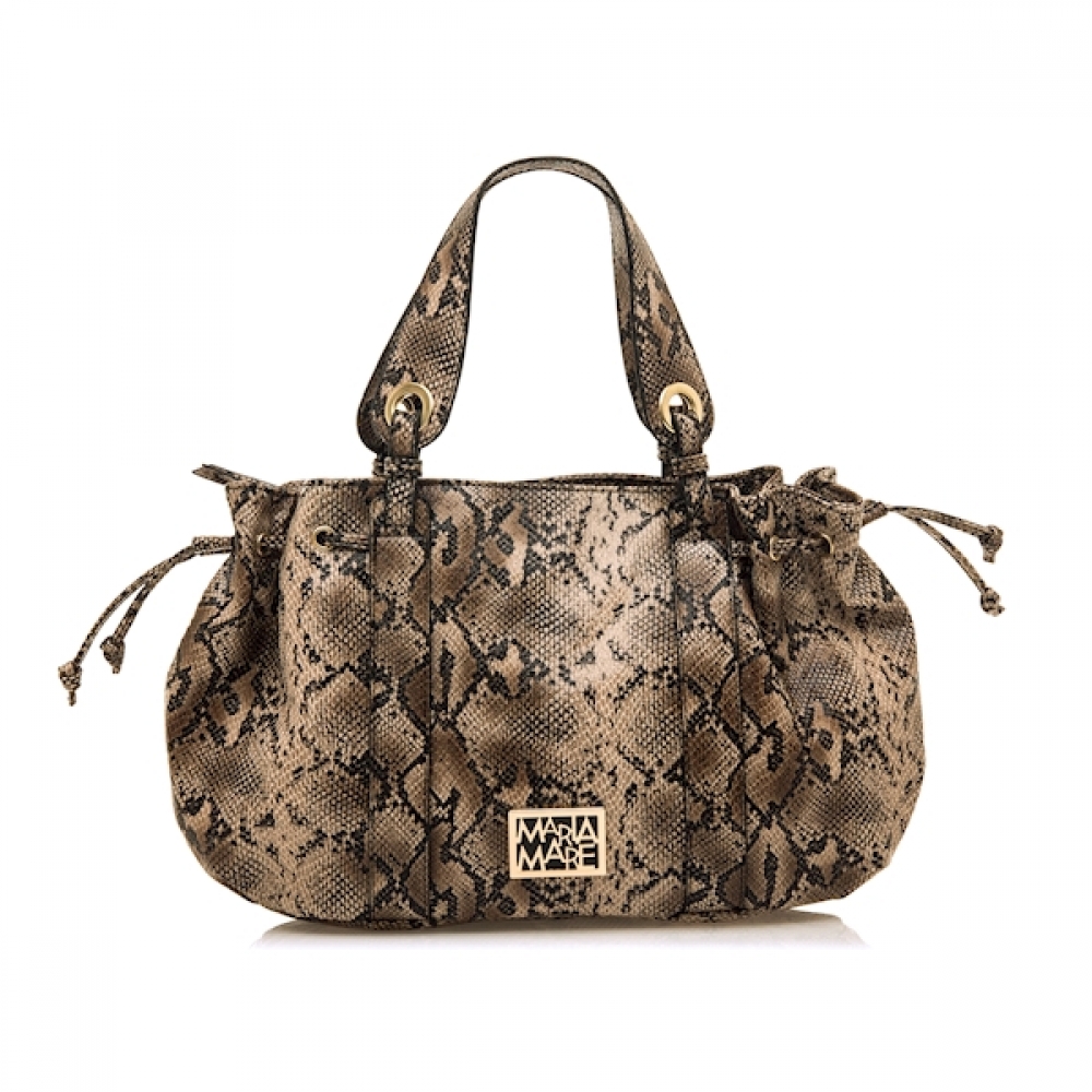 Bolso tipo bowling de Mariamare, modelo Stef de color beig para mujer, con acabado animal print efecto serpiente brillante que añade carácter a su diseño. Incorpora doble asa corta para llevarlo al hombro o en la mano, y cordones ajustables laterales que permiten modificar ligeramente su forma. El logo metálico dorado en la parte frontal baja aporta un toque distintivo. Su interior espacioso lo convierte en una opción práctica sin renunciar a un estilo con personalidad.
