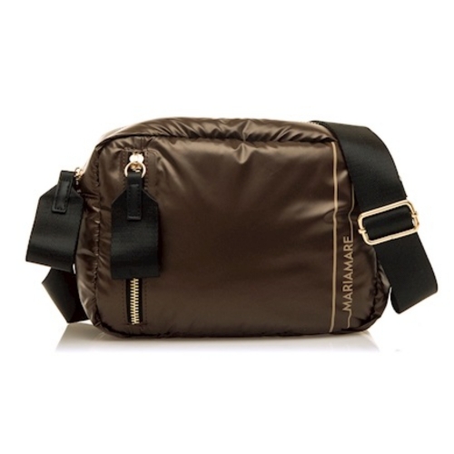 Bandolera de color moka para mujer, modelo Aure de la marca Mariamare. Fabricada en nylon con acabado brillante, ofrece un diseño funcional y moderno para acompañarte en tus actividades diarias. Su compartimento principal con cremallera dorada y su bolsillo exterior permiten un acceso rápido a tus objetos personales. Incluye una correa negra de webbing ajustable para mayor comodidad, perfecta para llevar cruzada o al hombro según tus preferencias.