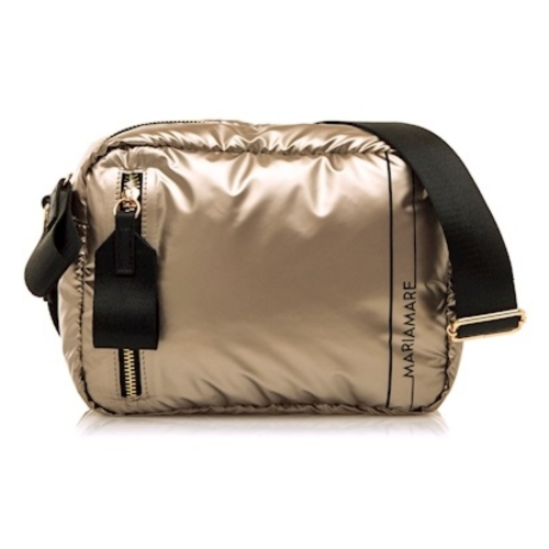 Bolso bandolera de mujer de la marca Mariamare, modelo Aure de color champagne. Con un diseño de acabado brillante, destaca por su estilo urbano y funcional. Incluye un compartimento principal con cremallera y un bolsillo exterior para acceder fácilmente a tus esenciales. La correa negra ajustable permite llevarla cómodamente cruzada o al hombro, adaptándose a tus necesidades en cada momento. Perfecta para quienes buscan un toque de estilo y comodidad.