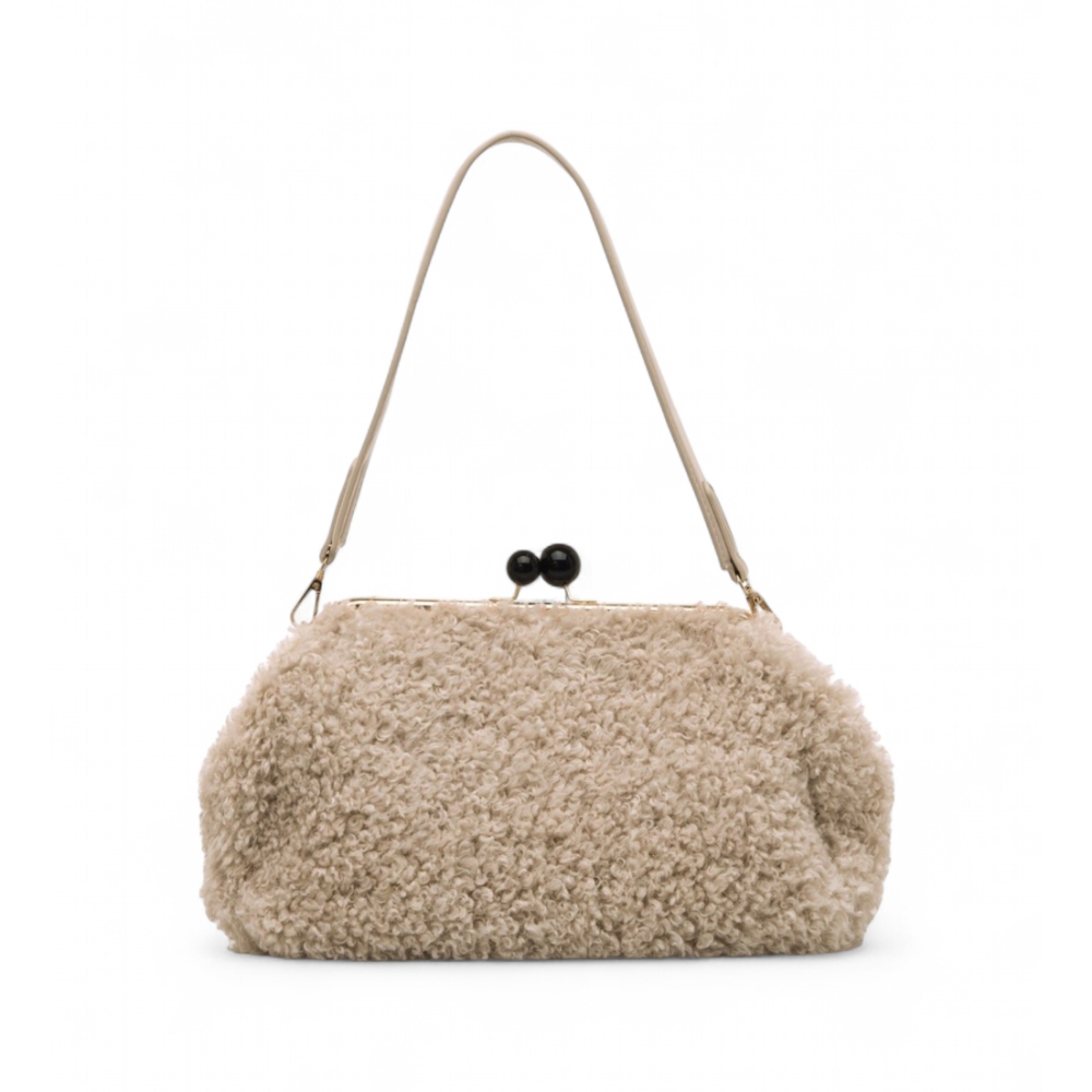 Bolso de mano para mujer de Mariamare, modelo Bolla de color hueso. Destaca por su textura con acabado efecto borreguillo que aporta un toque original y chic. Su diseño grande con estructura metálica dorada y cierre tipo kiss-lock con esferas negras evoca un estilo retro renovado. Dispone de un asa corta del mismo tono que ofrece comodidad para poder llevarlo al hombro o en la mano. Una opción elegante para completar tus looks.