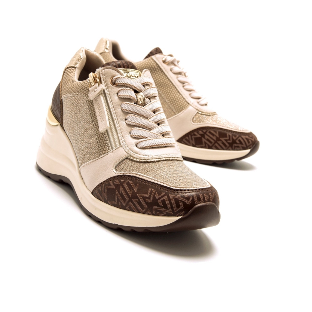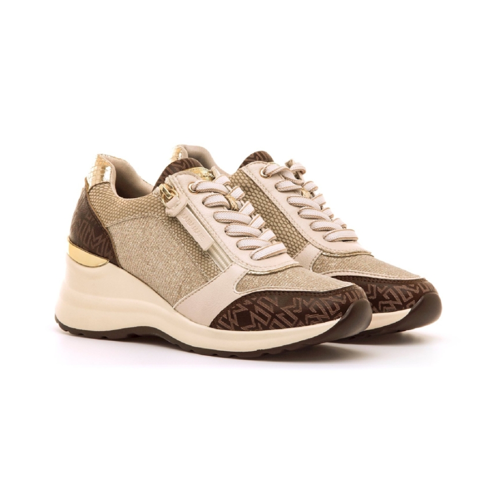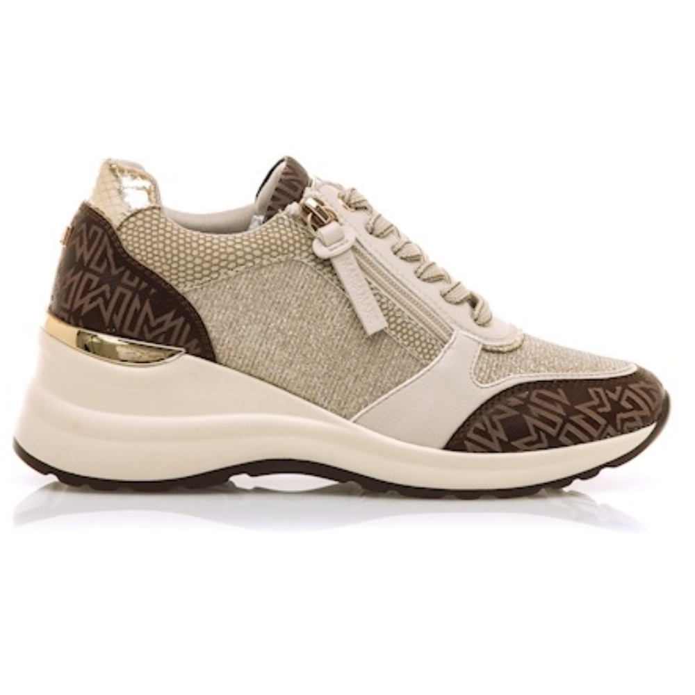Zapatos de cuña beig para mujer, modelo Cinzia de Mariamare. Presentan detalles en marrón con el logo estampado y detalles dorados en el tacón. La combinación de cierre de cordones y cremallera lateral aporta practicidad y un estilo urbano moderno, ideal para el día a día.