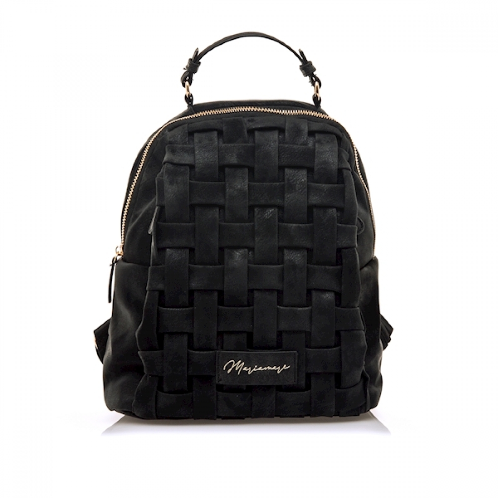 Mochila Maddi  para mujer de la marca Mariamare, con diseño frontal de tiras anchas entrelazadas que crea un efecto trenzado llamativo. Cuenta con asa superior y correas ajustables para mayor comodidad. El cierre con cremallera dorada asegura el interior, ideal para llevar lo necesario en tus desplazamientos. El detalle del logo dorado en la parte baja del frontal añade un toque distintivo que refuerza su estilo moderno y funcional.. Base 14. Ancho Altura 30.
