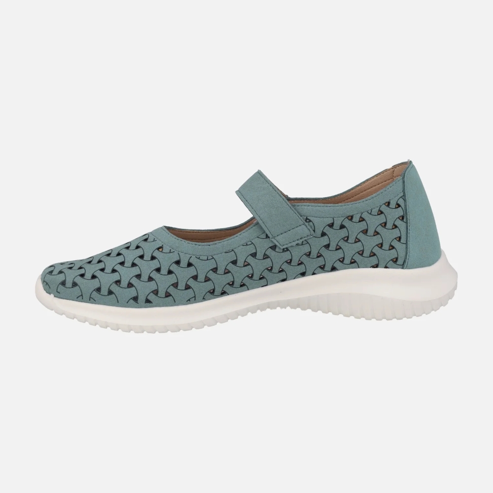 Zapatillas deportivas para mujer estilo merceditas de la marca Ecoligeros modelo Isa. Mercedes elaboradas en materiales sintéticos, con dibujos a láser y picados, cierre de velcro. Interiores en combinado de sintéticos y piel. Piso de goma super ligero, con una altura trasera de 3 cms. Disponibles en oro, azul jeans y beige.