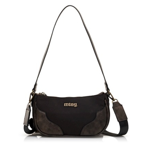Bolso bandolera de color moka de la marca Mustang, modelo Siara para mujer. Presenta una silueta compacta con diseño curvado y detalles en ante sintético que aportan contraste. Incluye dos asas intercambiables, una corta para llevar al hombro y otra larga ajustable tipo webbing para mayor versatilidad. El logo metálico Mustang en color dorado destaca sobre el frontal, añadiendo un toque distintivo. Ideal para completar looks casuales con un accesorio práctico y con personalidad.