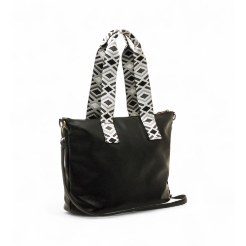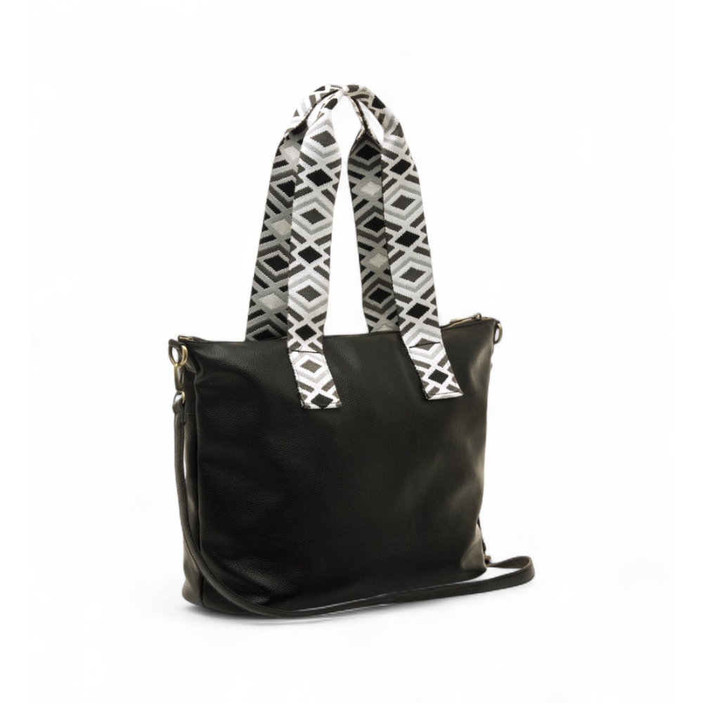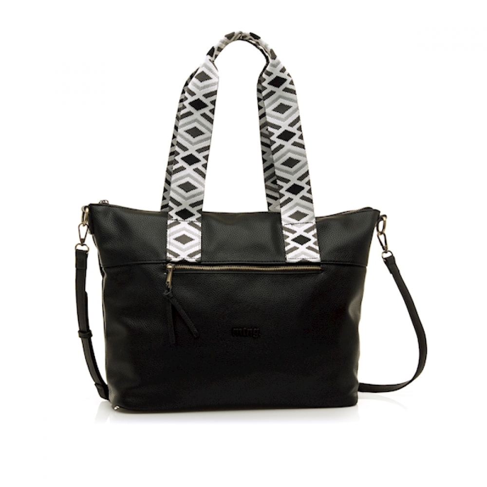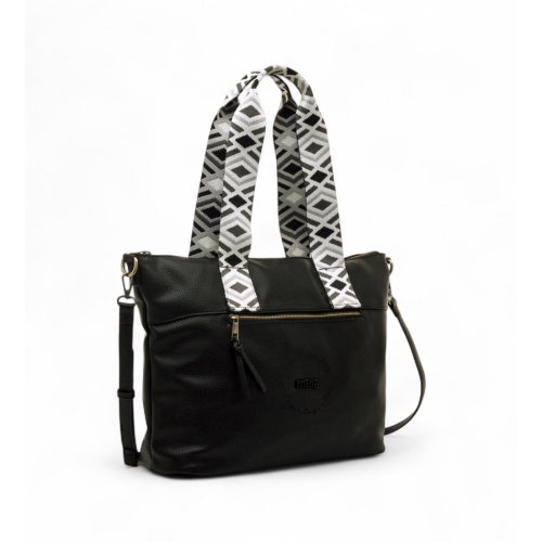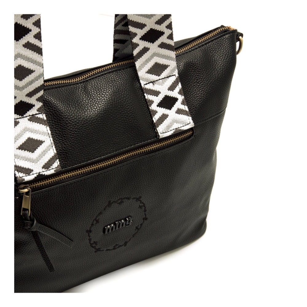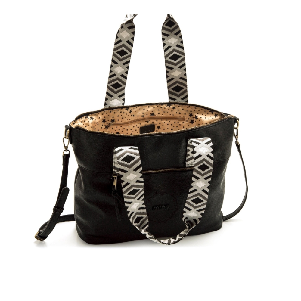 Bolso shopper negro de la marca Mustang, modelo Adna para mujer. Con acabado ligeramente texturizado, cuenta con doble asa de mano estampada en blanco y negro de estilo étnico, que aporta un toque distintivo al modelo. Dispone de cierre principal con cremallera dorada, bolsillo frontal con tirador decorativo y logo grabado en negro. El interior presenta un forro estampado con estrellas y varios compartimentos organizadores. Incluye además una correa ajustable y extraíble para mayor versatilidad. Ideal para diario por su gran capacidad y diseño urbano con personalidad.