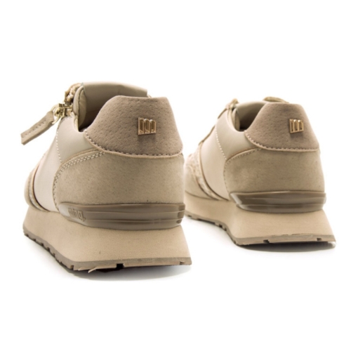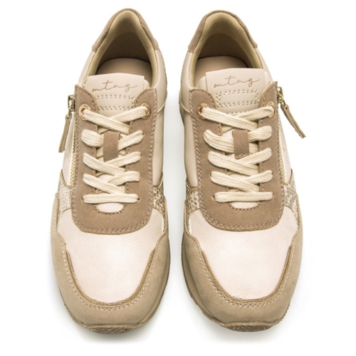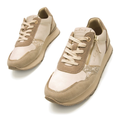 Zapatillas de color beige para mujer de MTNG, modelo Joggo Classic de estilo casual deportivo. Este diseño combina diferentes tonos de beige con detalles animal print de serpiente en los laterales y cierre con cremallera decorativa dorada.