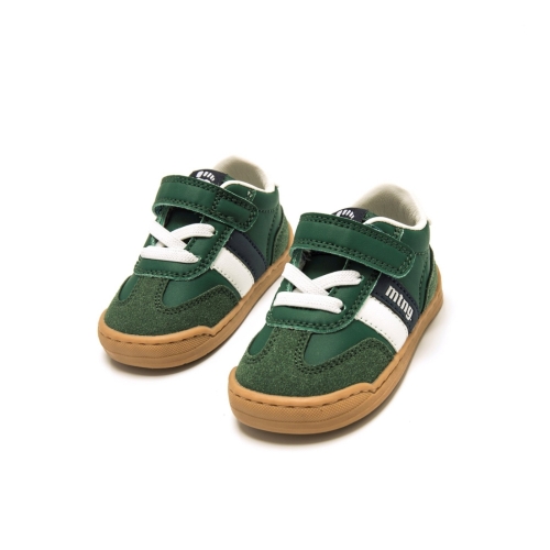 Zapatillas de color verde para bebé, modelo Free Baby de la marca mtng. Con detalles en blanco y azul marino, su diseño de estilo casual incorpora cierre adhesivo y cordones elásticos para un ajuste práctico. Diseñada y desarrollada especialmente en colaboración con el Dr. Juanjo López, traumatólogo deportivo e infantil, para respetar el desarrollo natural del pie de los niños. Gracias a su puntera ancha permite el libre movimiento de los dedos dentro del zapato. Su suela tiene 3 mm de grosor y con zero drop (totalmente plana) respeta el natural desarrollo del pie del pequeño y sus elementos flexibles y torsionables hace que el pie del niño no esté encorsetado por la estructura del zapato. Las plantillas extraíbles facilitan comprobar si la talla del calzado es la correcta para tu hijo. Además, su fácil apertura facilita que el niño pueda descalzarse y calzarse de forma autónoma. Acompaña los primeros pasos de tu bebé con mtng. Con certificado VEGANO sellado por INESCOP, el cual garantiza que la naturaleza química principal del material no se corresponde con fibras de origen animal.