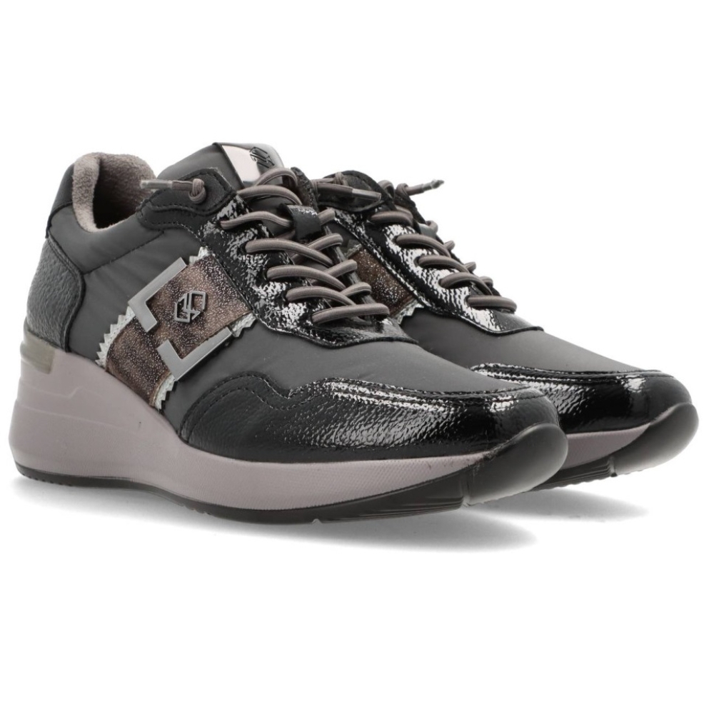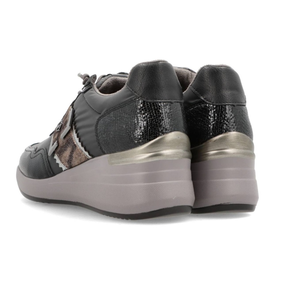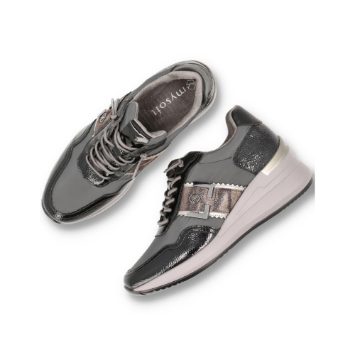 Zapatillas deportivas para mujer 25M591 de MYSOFT. De PU Leather y detalles print anímal. Con cierre de cordones y cuña de unos 6cm de altura. Interior en tejido suave, con plantilla extraible memory foam que aporta un plus a la pisada, haciendola más comoda.