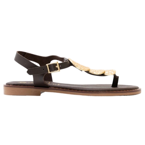 Sandalia de mujer fabricada en piel de color marrón. El color marrón o moka es tendencia esta temporada, así como las esclavas y las monedas doradas, por lo que la sandalia Elisa será un top ventas asegurado esta primavera-verano. Esta sandalia tipo griega será un flechazo que no podrás resistir. No te quedes sin este bestseller.