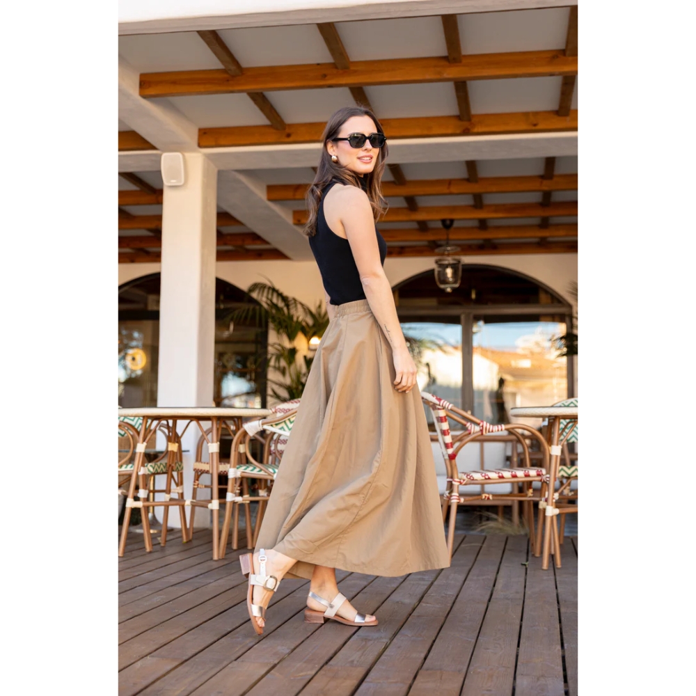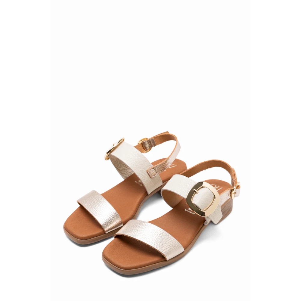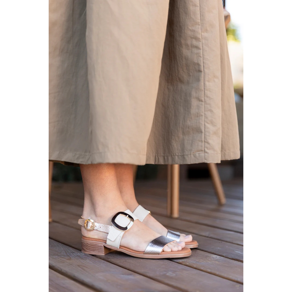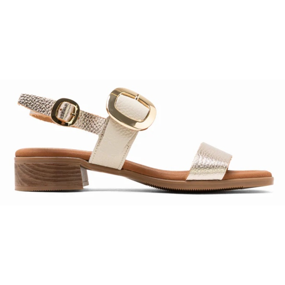 Sandalia de mujer con tacón fabricada en piel. Diseño en tiras color champán y hielo, con un suave grabado sobre la piel y dos hebillas doradas para un ajuste perfecto. El modelo Leticia es ideal para ofrecer estabilidad y amortiguar tu pisada gracias a su planta acolchada de microfibra transpirable y su suela de goma flexible y antideslizante.