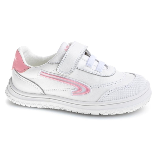 Deportiva barefoot de piel de la marca Pablosky para niña. Fabricada en España con piel de gran calidad con velcros y gomas elásticas. Color blanco y rosa