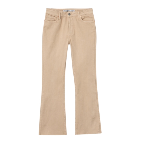 Jeans de tiro alto con cinco bolsillos. Cierre frontal con cremallera y botón metálico. Bajo acabado desflecado.