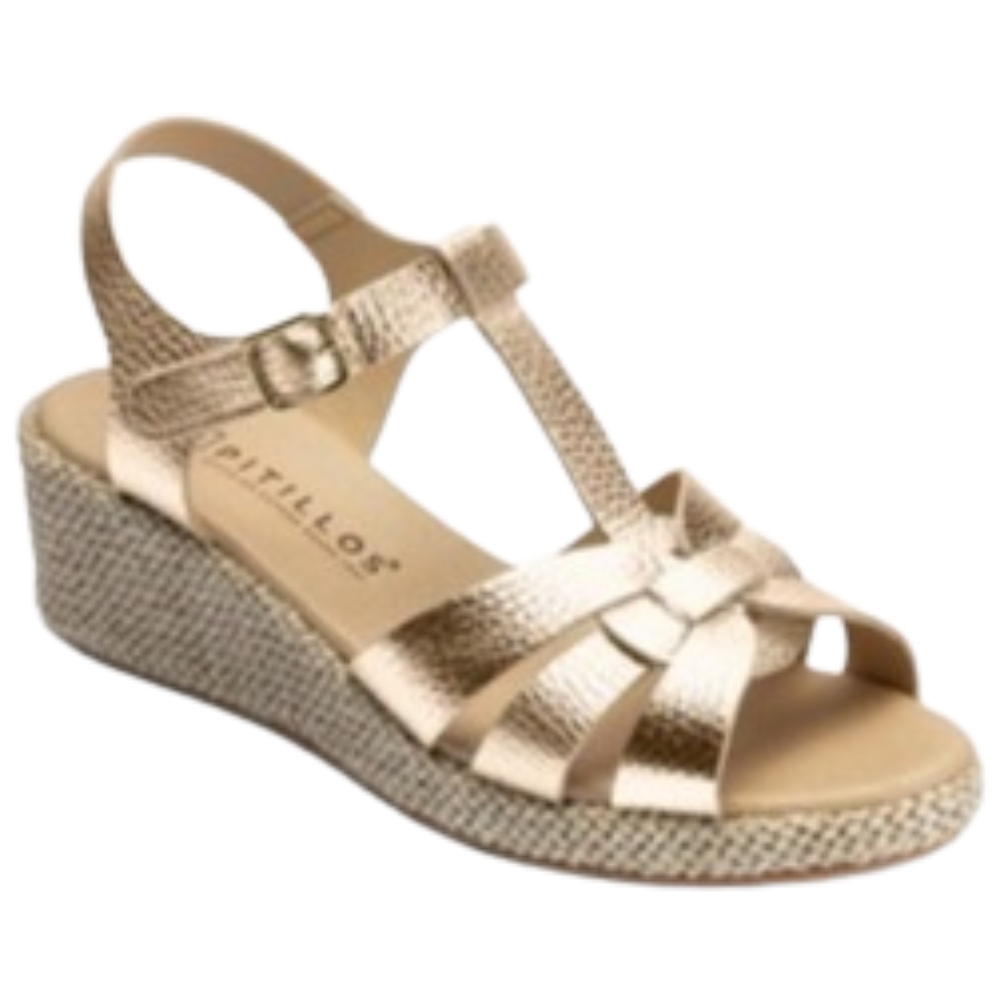 Sandalia con cuña de la marca Pitillos para mujer. Fabricada en España con piel de gran calidad. Color oro