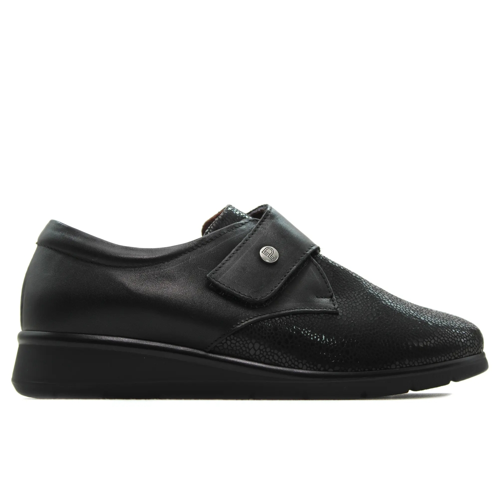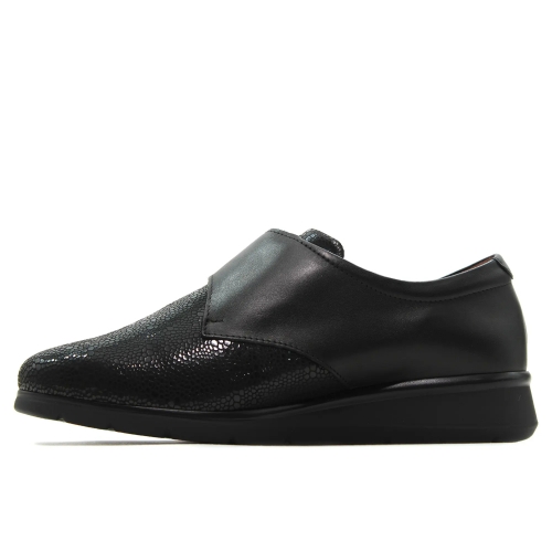 Zapato para mujer, mocasín de estilo deportivo, tipo sneakers, con cuña baja de 4 cm de altura. Estilo casual,para diario, fabricado en piel y tela. Cierre de tira con adesivo. Pitillos 10710 color Negro. Hecho en España. Modelo sencillo y clásico ideal para fondo de armario. Sencillo, clásico.