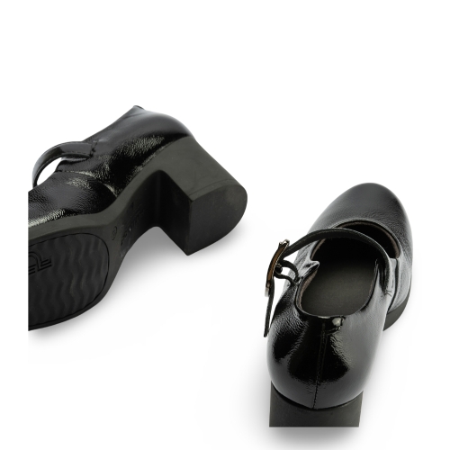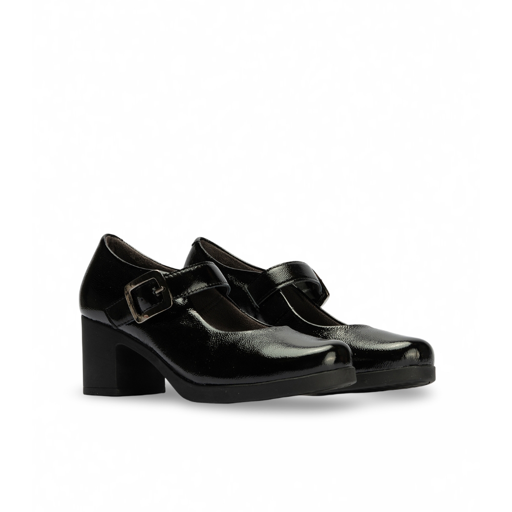 Zapato de tacón Pitillos 30100. Acabado en charol negro con una tira ancha y hebilla que aporta un toque retro muy sofisticado. Ideal para eventos o el día a día si buscas un zapato cómodo con personalidad.