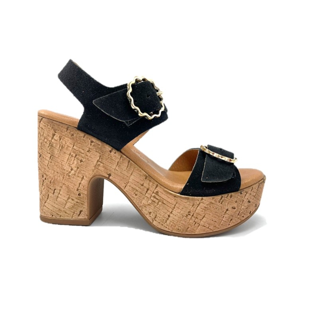 Sandalia con tacón y plataforma, fabricada en piel de gran calidad con plantilla de gel extracómoda. Color negro