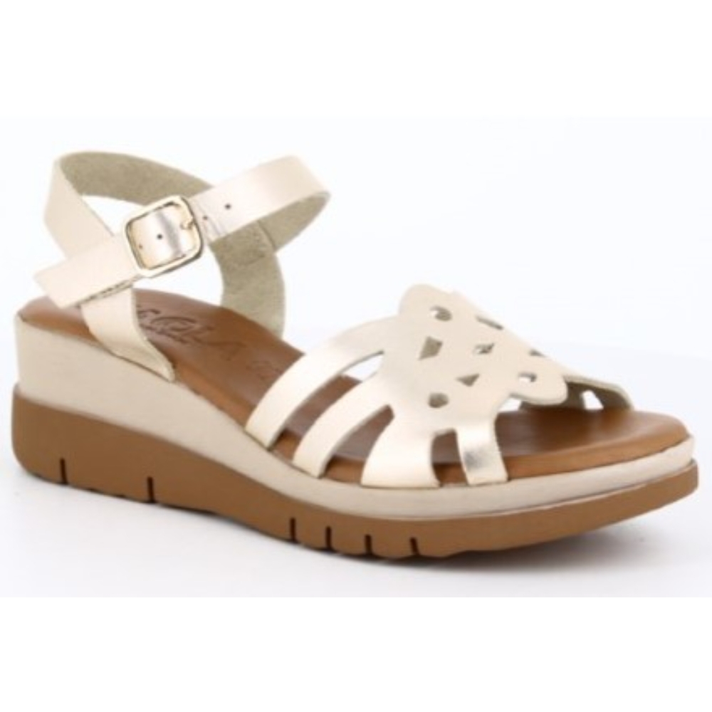 Sandalia de la marca Rivera con cuña y plantilla de gel. Fabricada en España con piel de gran calidad. Color platino