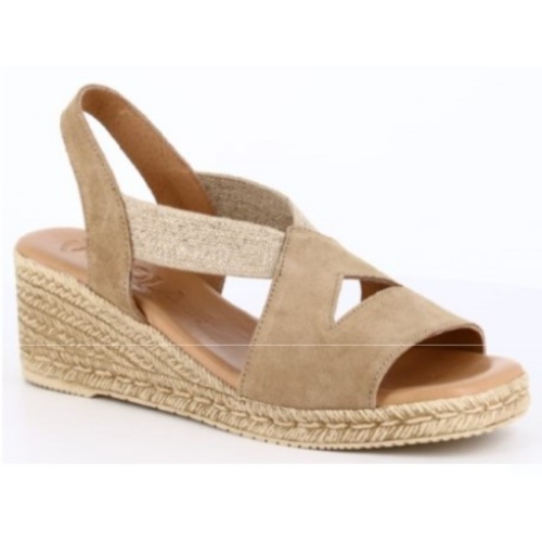 Sandalia con cuña baja para mujer. Fabricado en piel de gran calidad con plantilla de gel acolchada. Su ajuste con gomas en el empeine te aportará una comodidad extra. Color camel