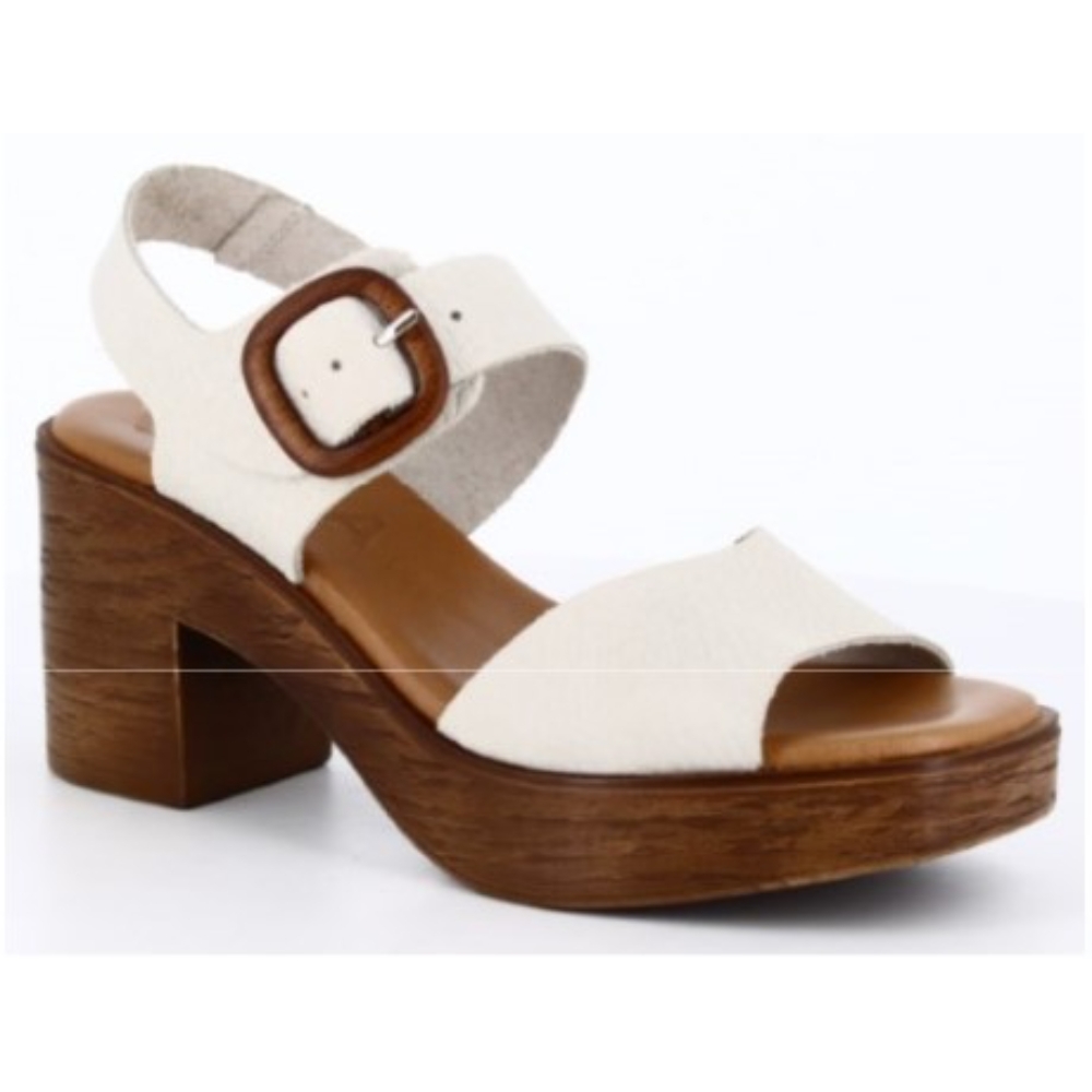 Sandalia de la marca Rivera con tacón y plantilla de gel. Fabricada en España con piel de gran calidad. Color nata