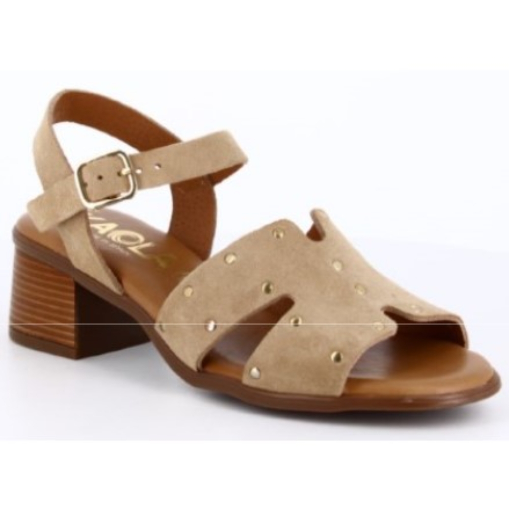 Sandalia de tacon bajo de la marca Rivera para mujer. Fabricada en España con piel de gran calidad y plantilla acolchada. Color camel