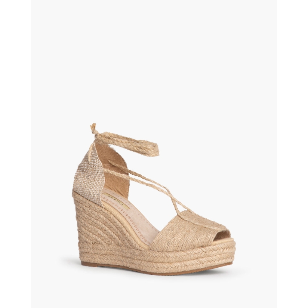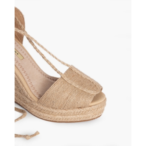 Plataforma tipo valenciana, con cuña en yute. Corte trenzado. Cierre mediante tiras trenzadas y anudadas al tobillo.