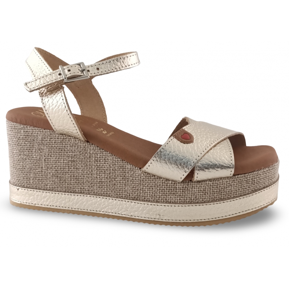Maravillosa sandalia para mujer de la marca Rivera. Una sandalia que cuenta con cuña y plataforma, plantilla de gel, dos tiras de piel champán cruzadas en la pala y cierre mediante hebilla en el tobillo.