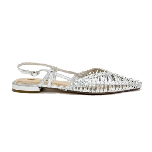 Sandalia plana, corte metalizado. Acabado en punta. Tira en el talón con hebilla en la parte exterior.