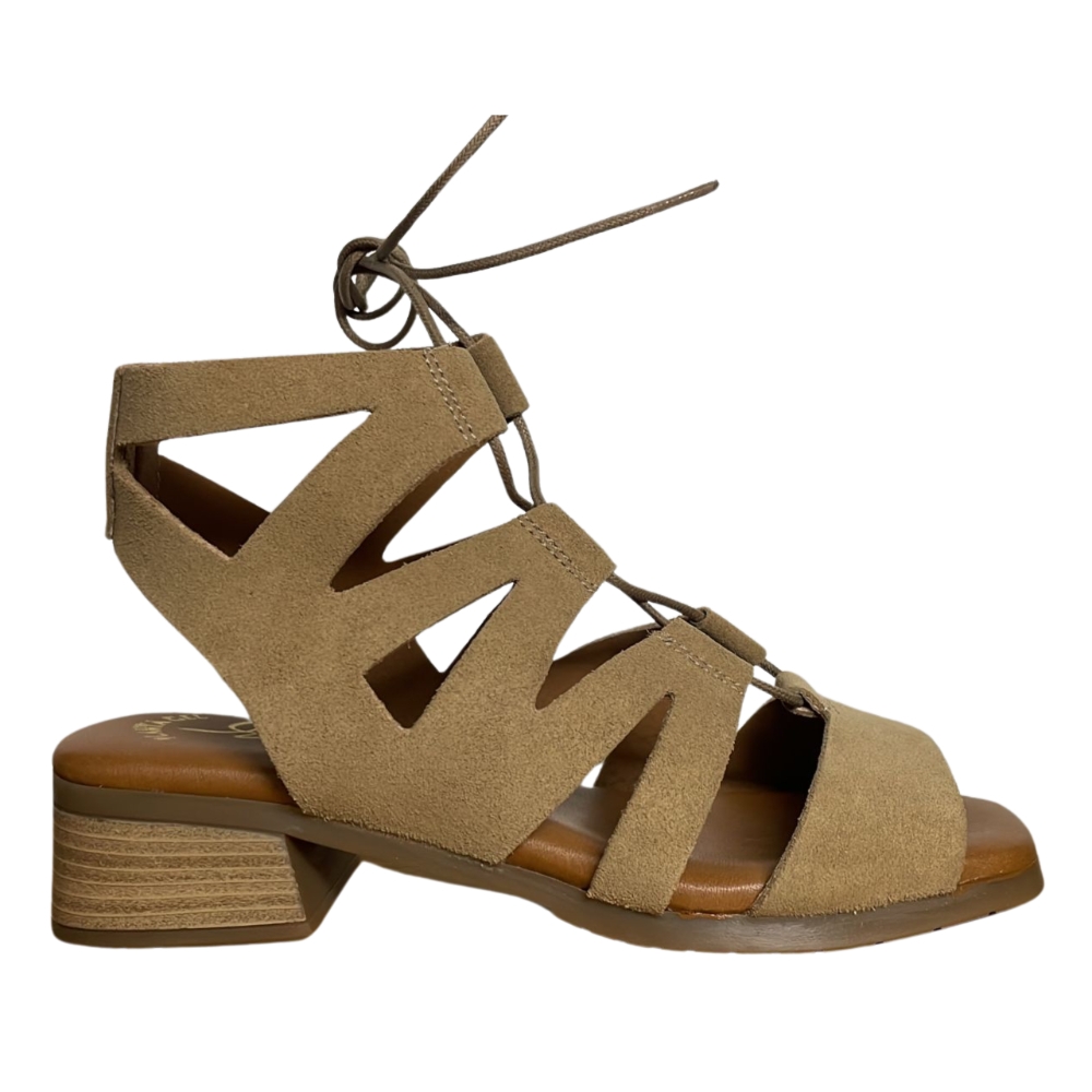 Sandalia tipo romana de Rivera en serraje color camello con tacón bajo y cierre de cordones.
