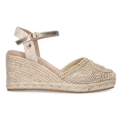 Sandalia estilo valenciana de la marca Etika para mujer. Fabricada con cuña de esparto. Color oro