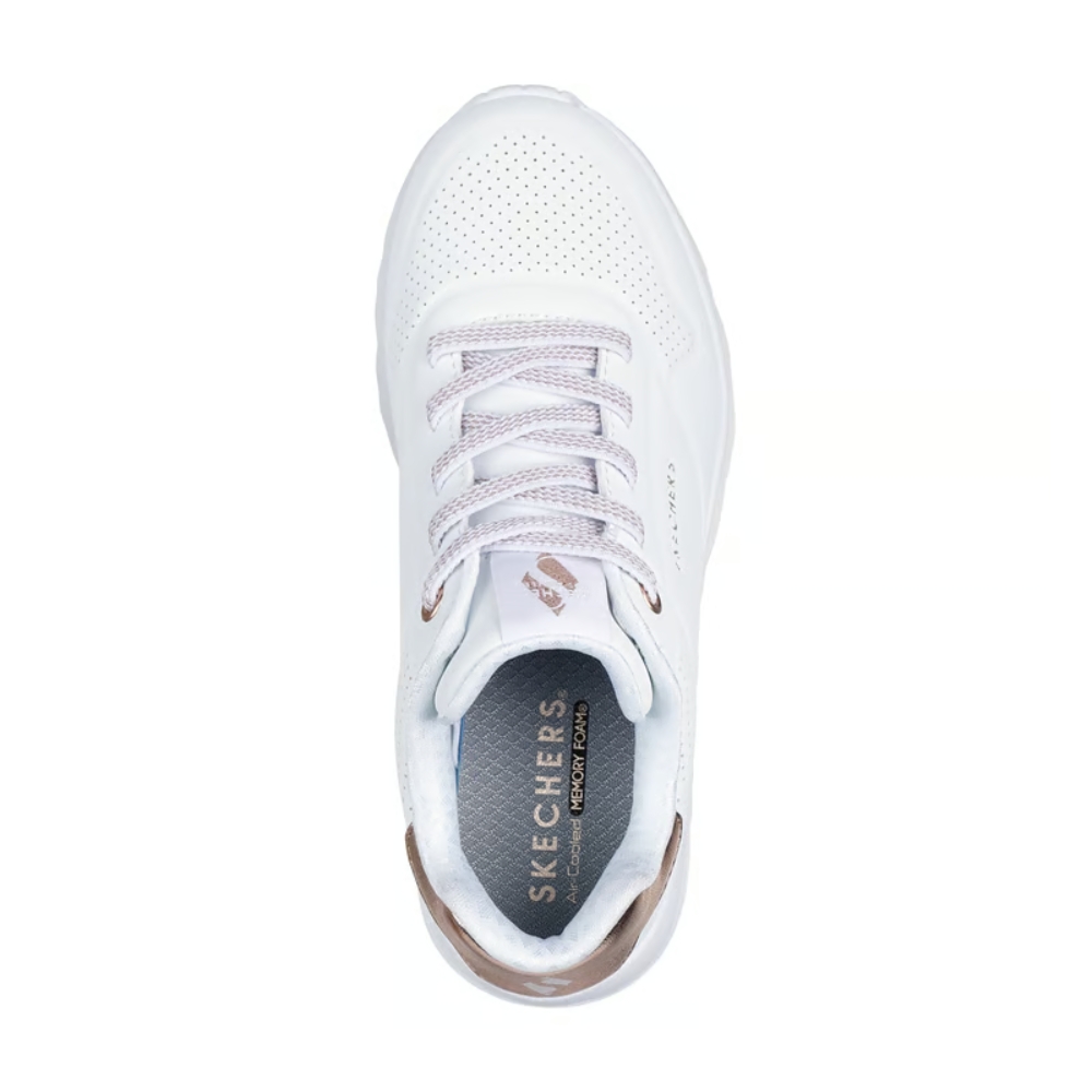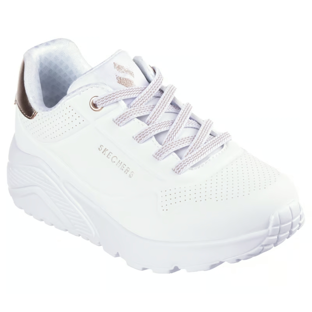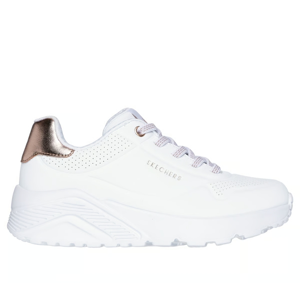 Sube el nivel de tus zapatillas con la comodidad y la amortiguación de Skechers Street™ Uno Lite. Este modelo moderno con cordones elásticos presenta una parte superior de sintética de durabuck con ribete metalizado, cierre Adaptive Closure de Skechers, plantilla Skechers Air-Cooled Memory Foam® y media suela con amortiguación con cuña de plataforma.