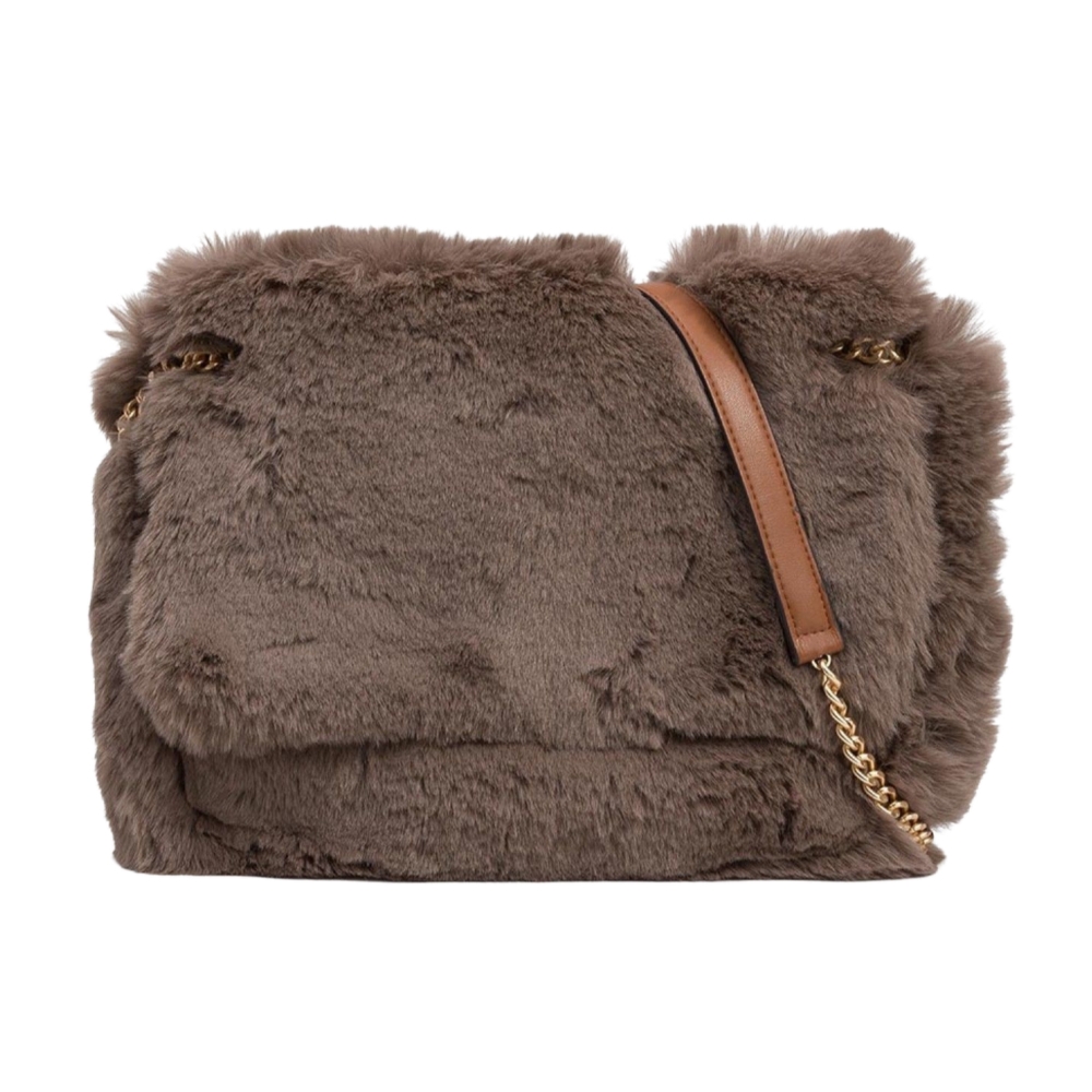 Bolso bandolera de pelo sintético, con solapa y cierre magnético. Asa ajustable combinada con cadena. Bolsillos interiores. Tamaño mediano. Dimensiones: 33 x 29 x 13 cm