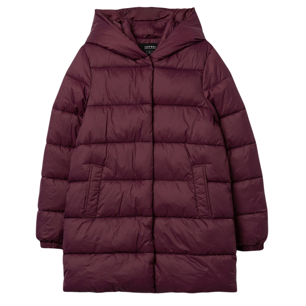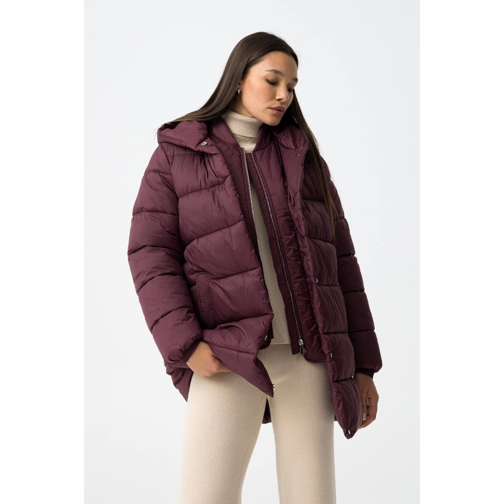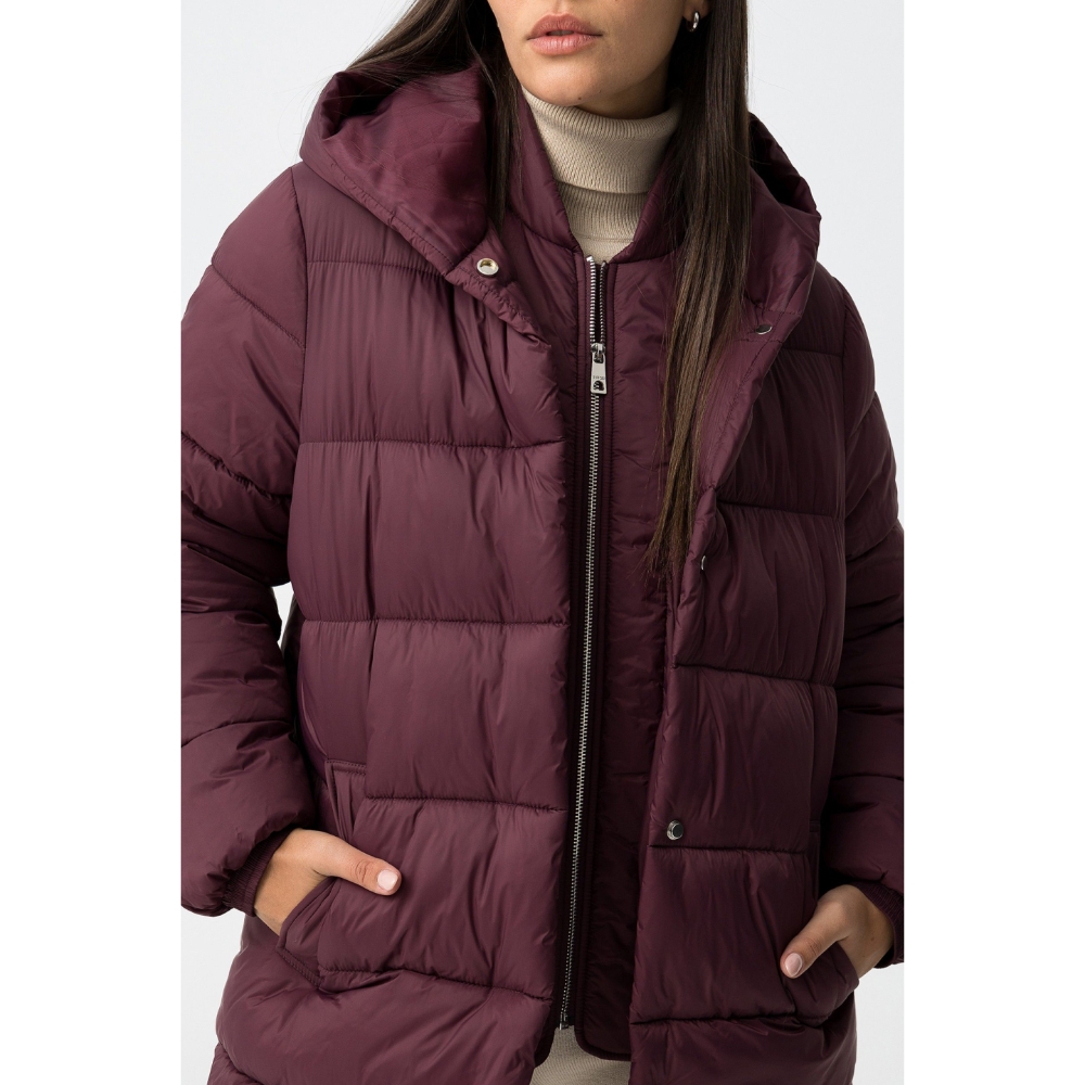 Abrigo largo relaxed fit de nylon acolchado, con dos bolsillos frontales. Cierre de cremallera frontal con tapeta reforzada con botones de presión. Capucha y manga larga con puños elásticos. Interior con tira bandolera.