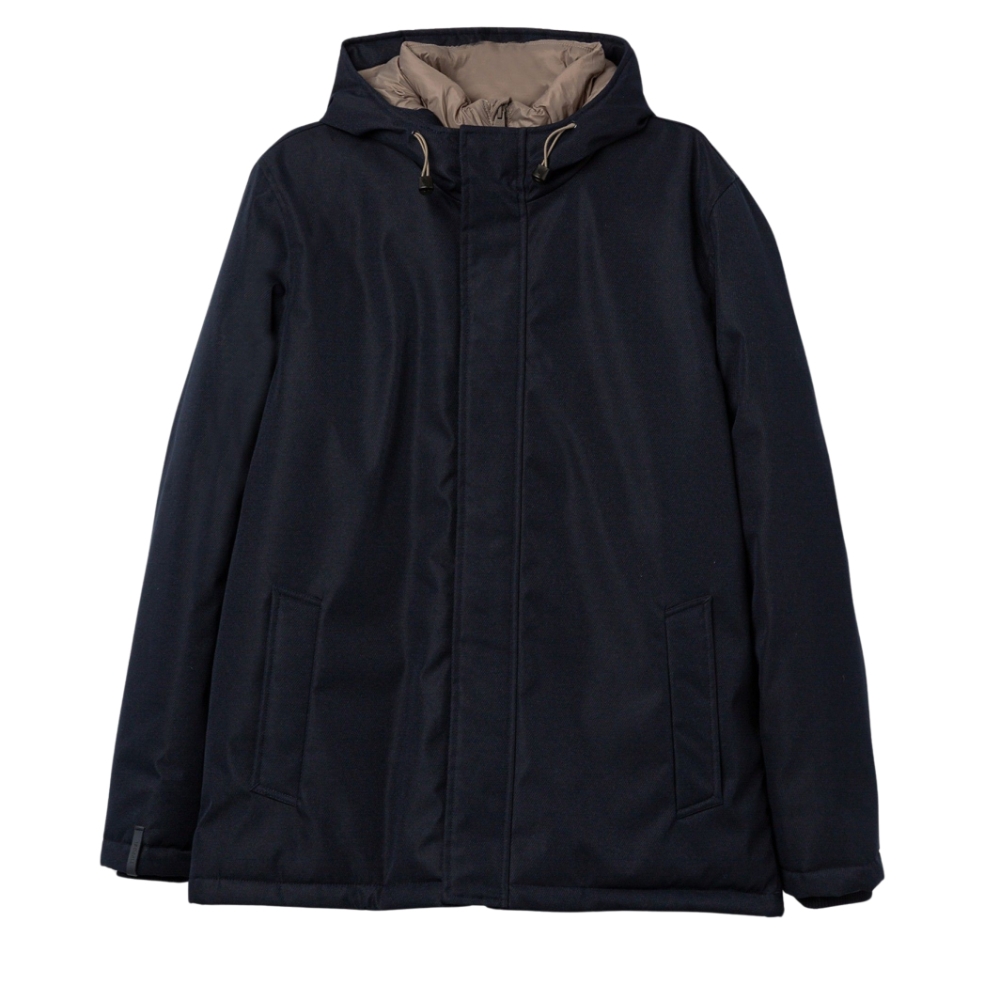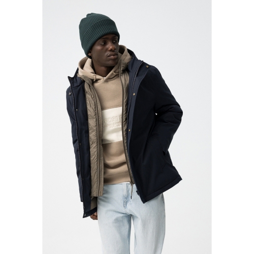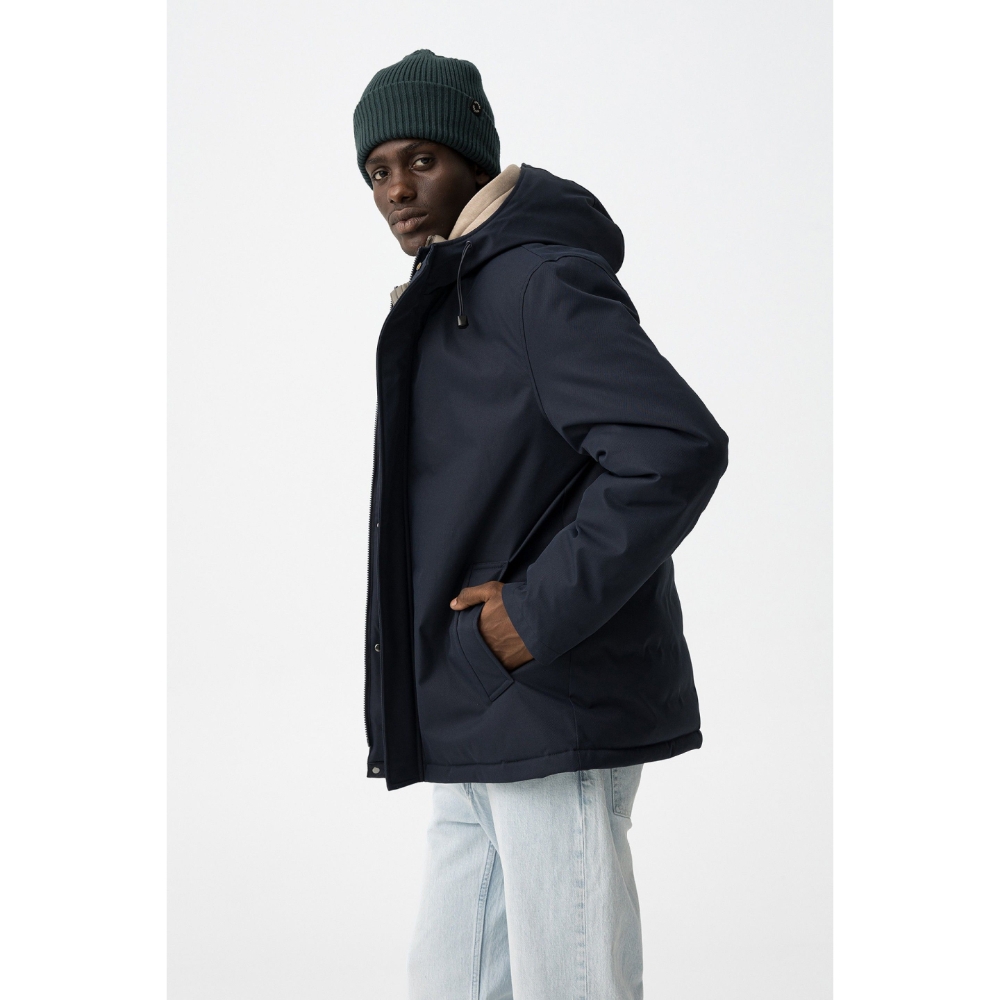 Abrigo largo en azul marino oscuro, corte regular, capucha ajustable y bolsillos laterales.100% POLYESTER
