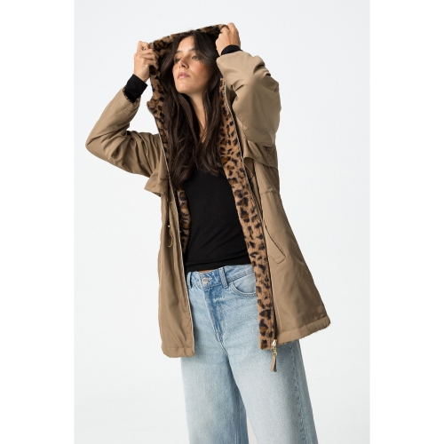 Parka relaxed fit de manga larga con capucha. Cremallera frontal. Bolsillos laterales y ajuste de cintura con cordón. Reversible: un lado en tejido liso y otro en pelo sintético.