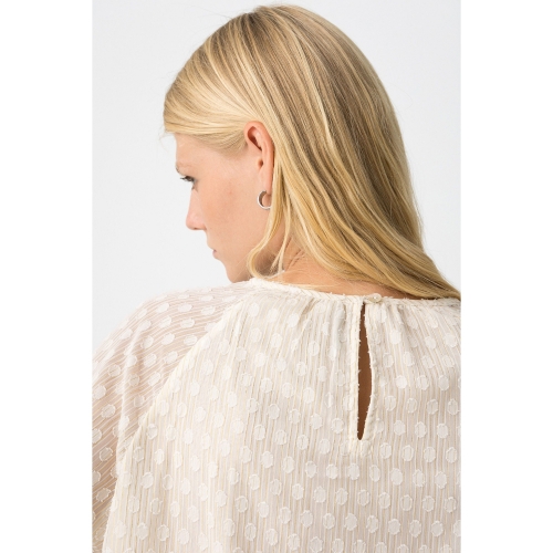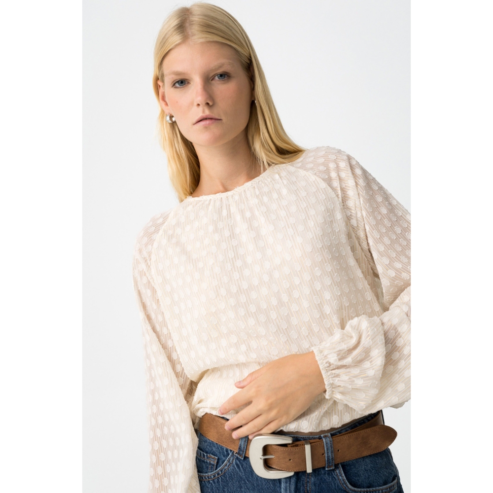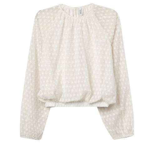 Blusa relaxed fit bordada con hilo metálico. Cuello redondo con cierre de botón trasero, manga larga y acabados con elástico interior.