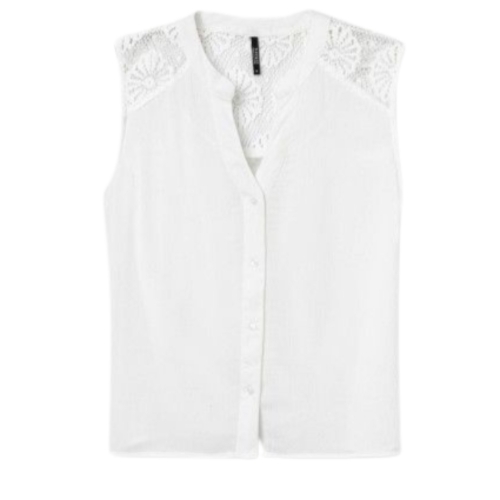 Blusa sin mangas de tejido arrugado con abertura en V al frente y pequeño cuello alto. Aplique y pliegue en la parte posterior.