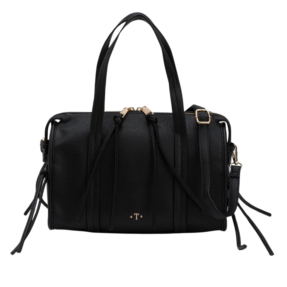 Bolso bowling efecto piel con apliques metálicos, flecos laterales y cierre superior de cremallera. Asas de hombro fijas.100% POLYURETHANE