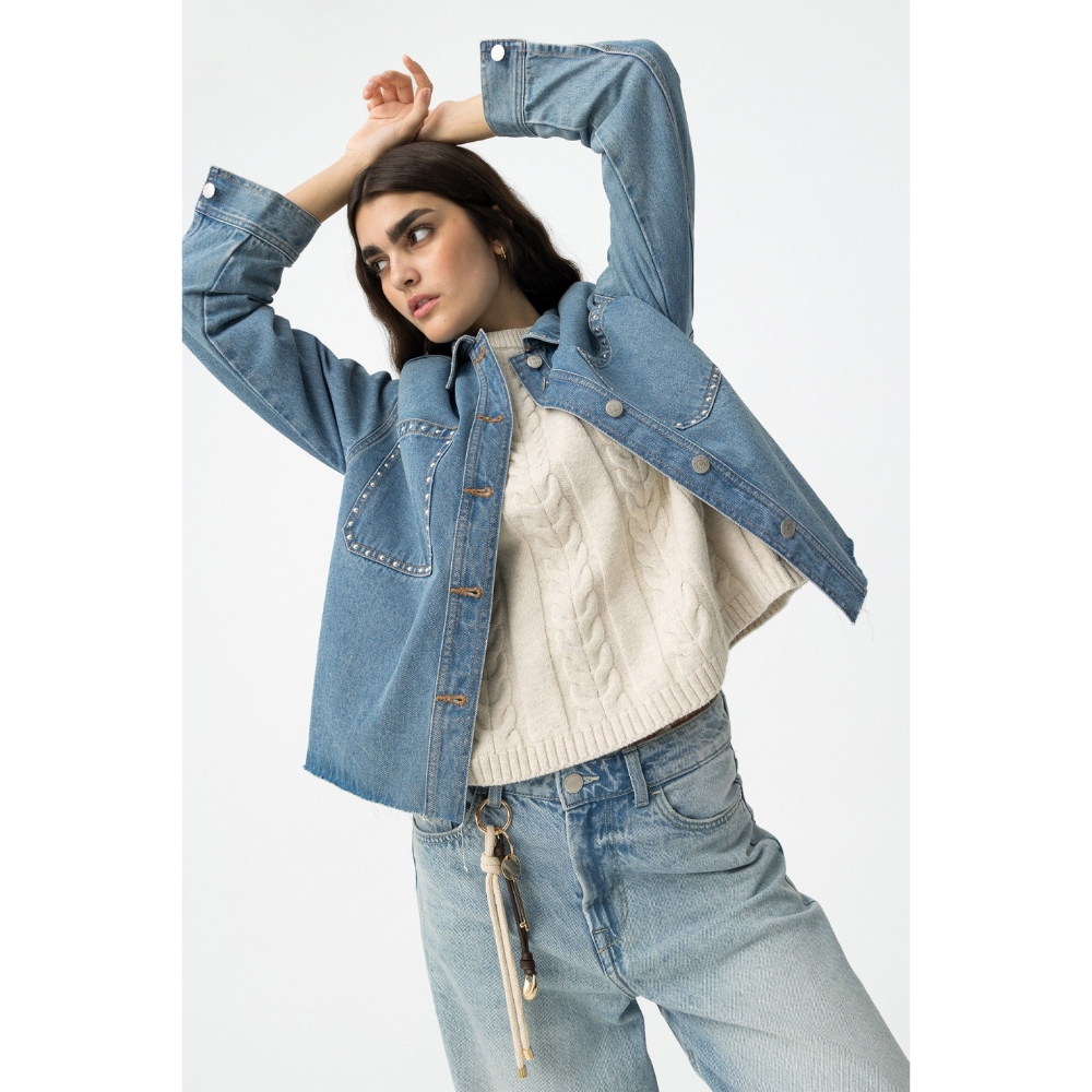 Camisa denim relaxed fit con dos bolsillos de parche frontales y aplicaciones metálicas. Cuello camisero, manga larga, cierre de botón metálico y bajo deshilachado.100% COTTON
