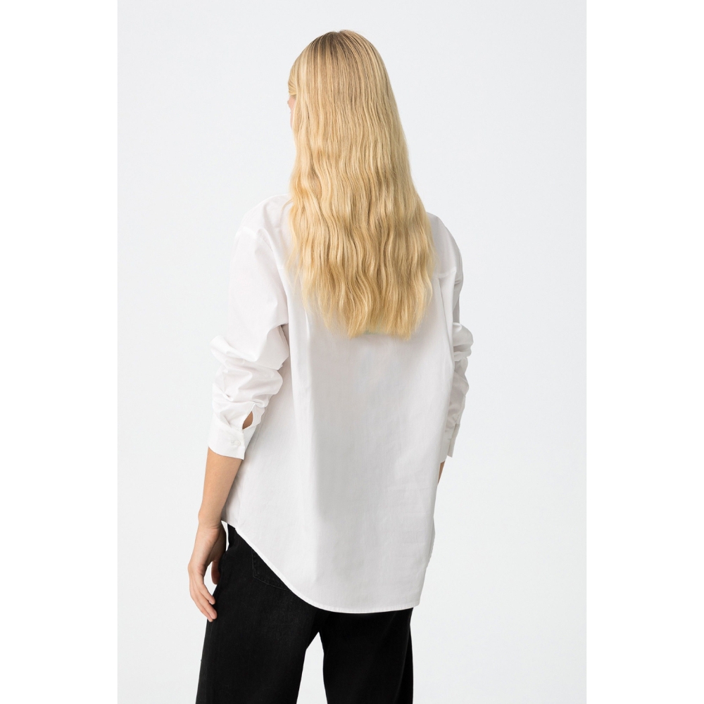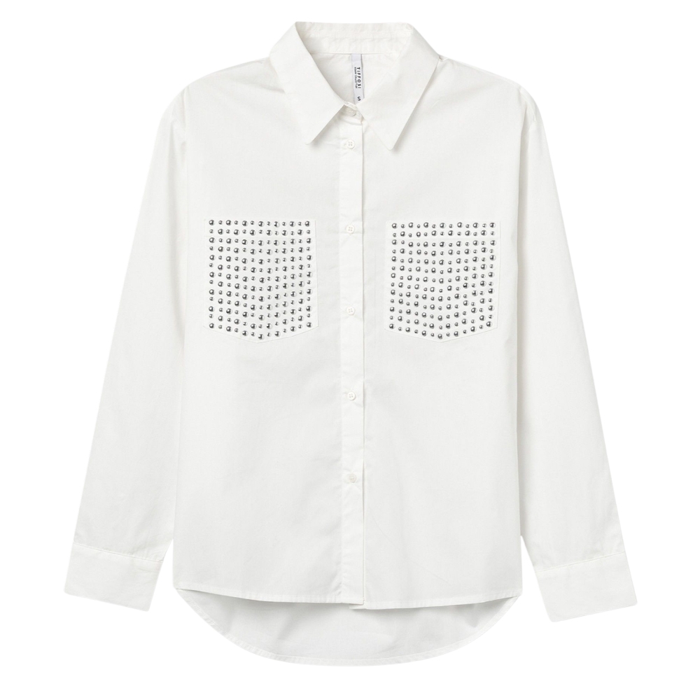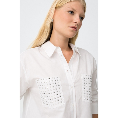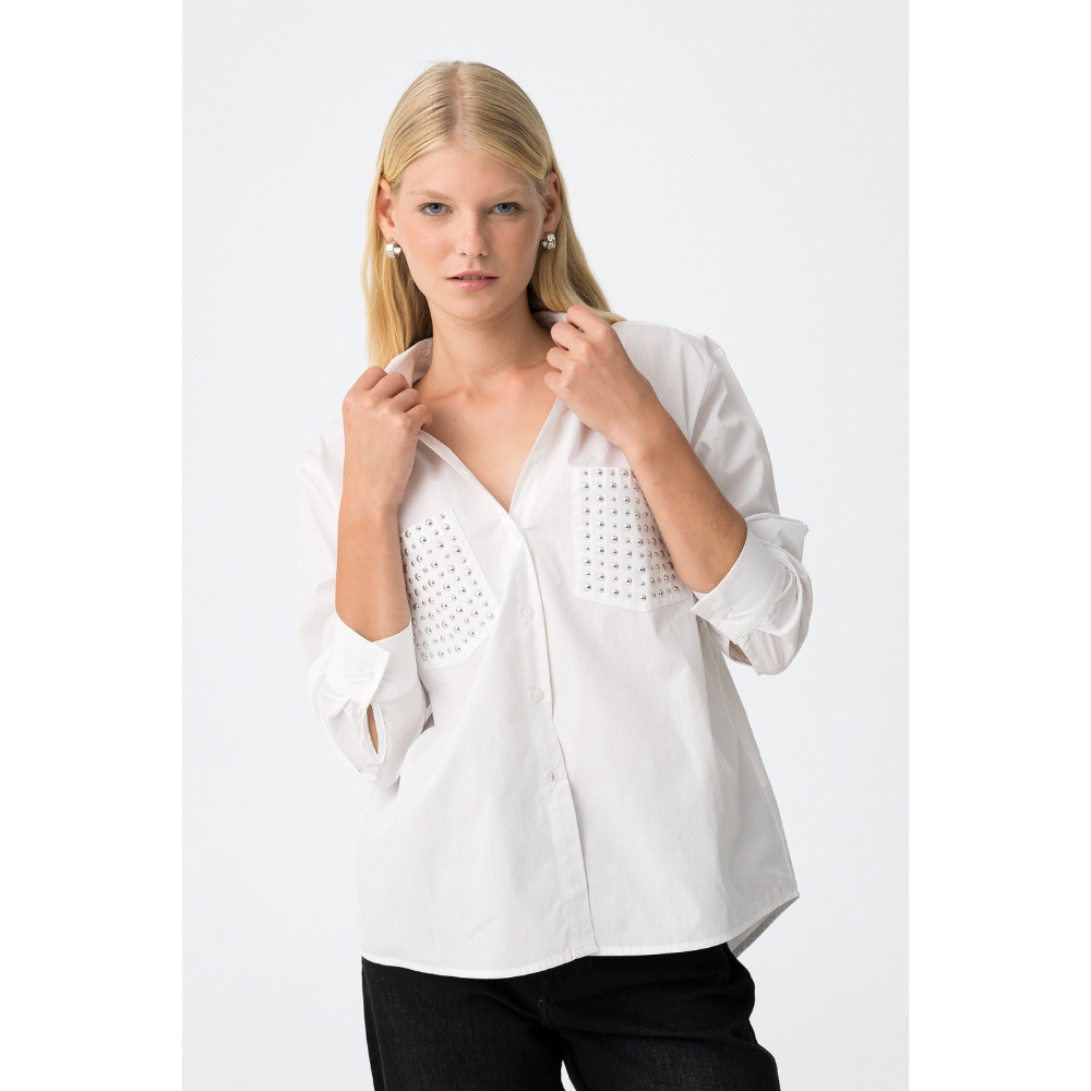 Camisa relaxed fit de algodón, con dos bolsillos de parche frontales y apliques metálicos. Cuello camisero, manga larga con botones en los puños y bajo curvo asimétrico.100% COTTON