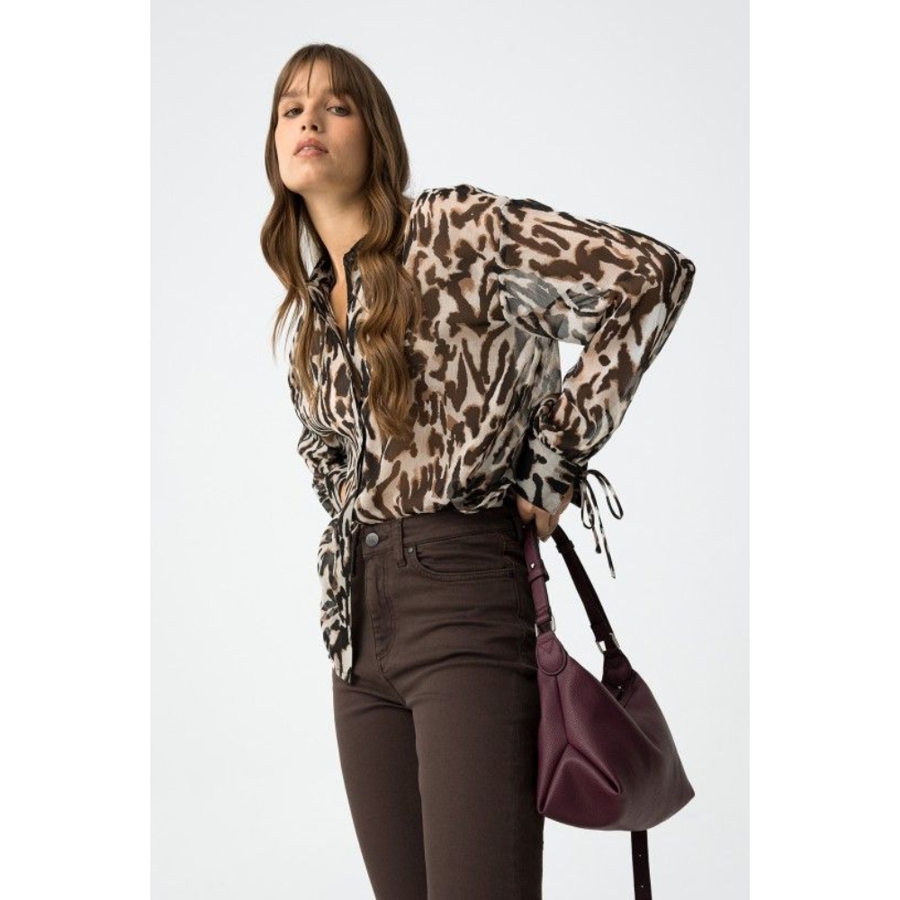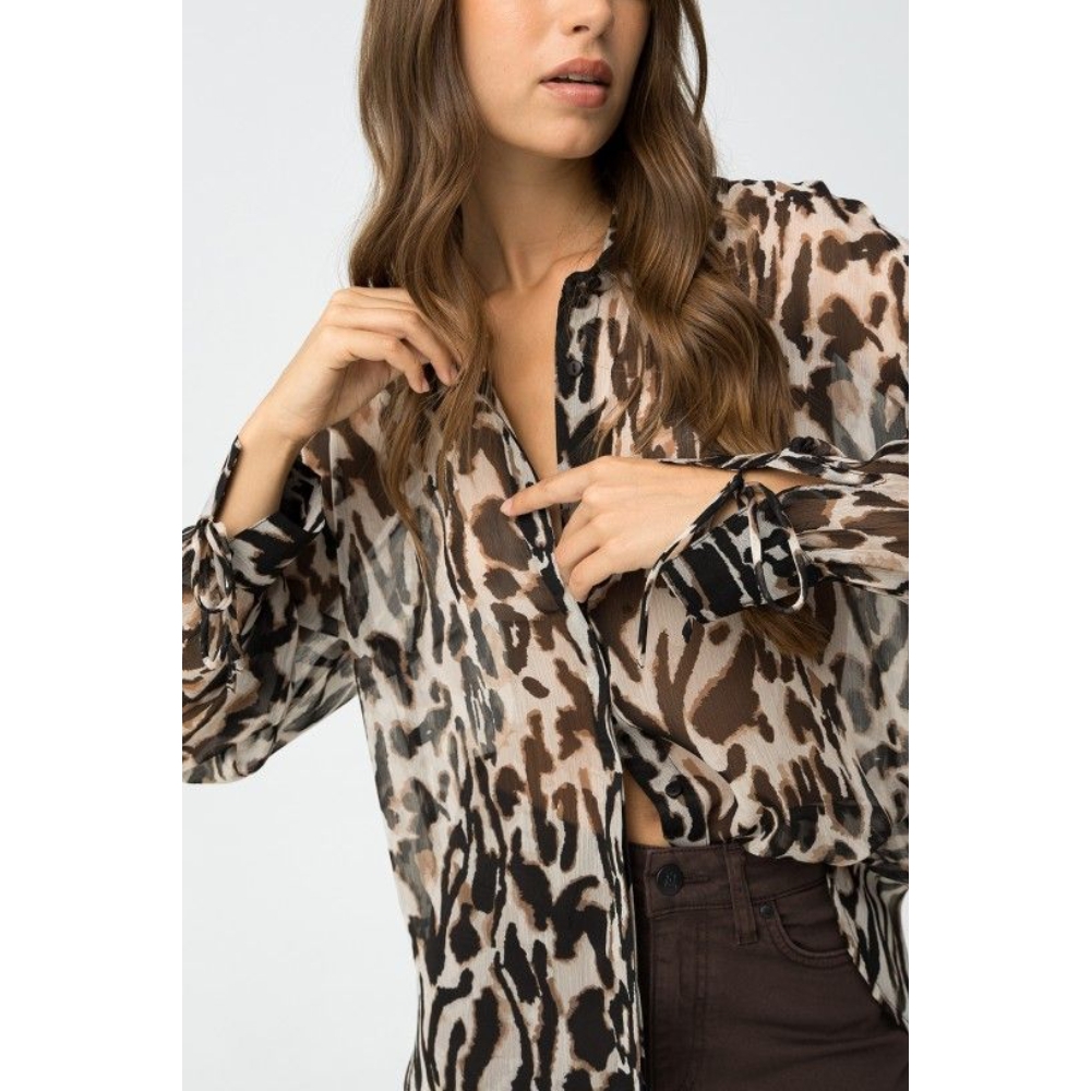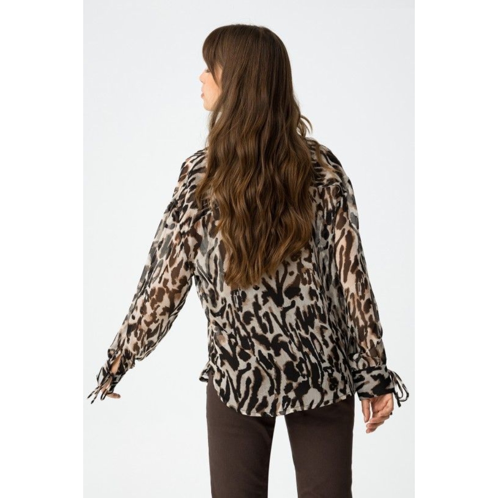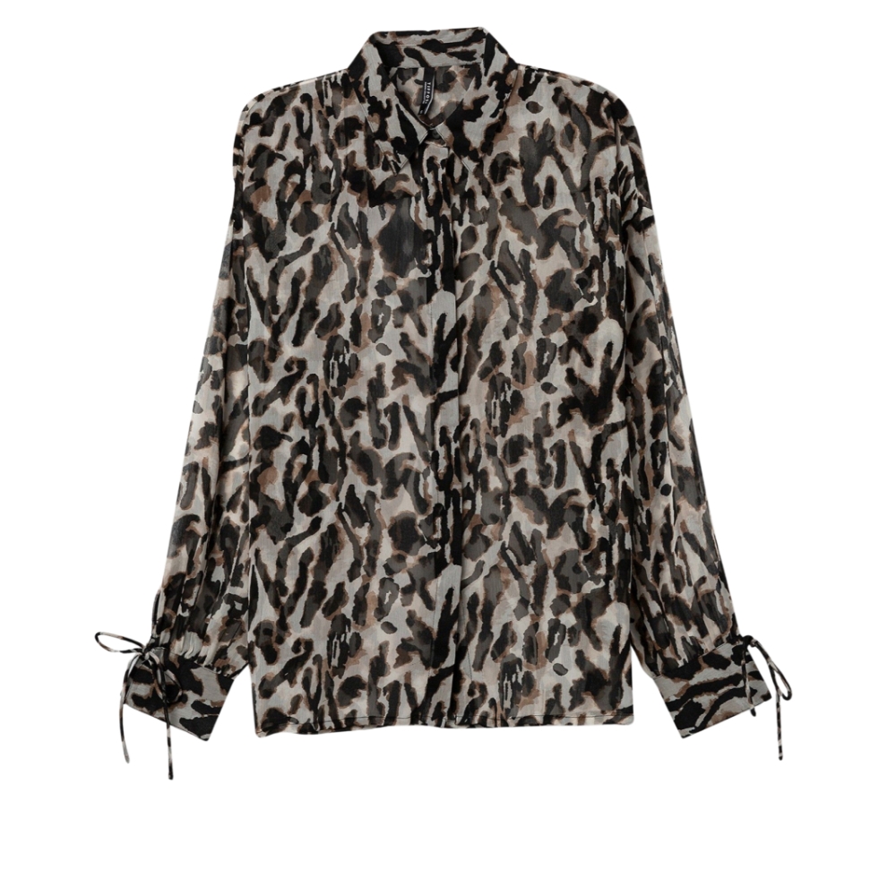 Camisa relaxed fit semitransparente con estampado de leopardo. Cuello camisero, manga larga con lazos en los puños y bajo curvo asimétrico.100% POLYESTER