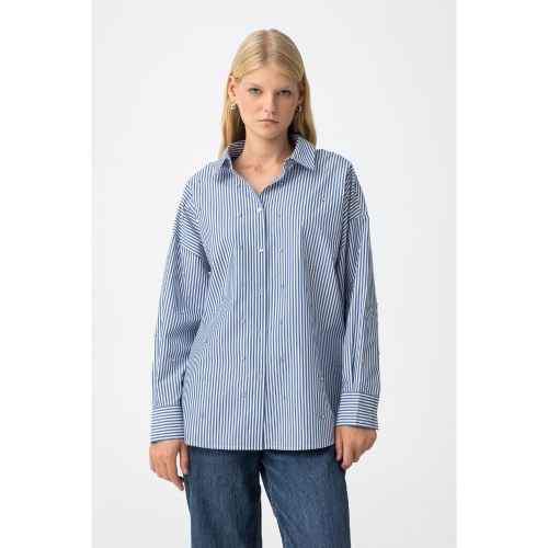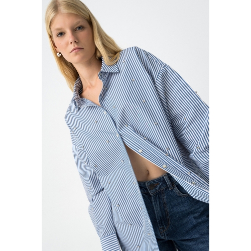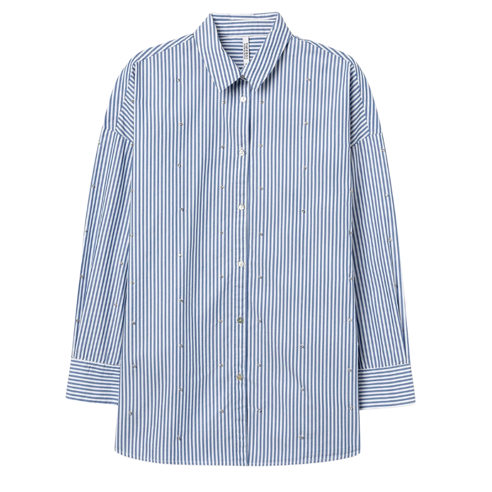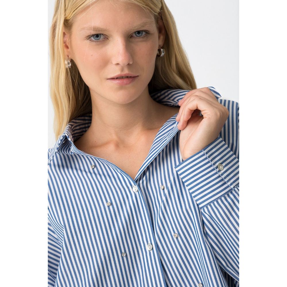 Camisa oversized a rayas con aplicaciones de joyas. Cuello camisero, cierre frontal con botones, manga larga con botones en los puños y bajo curvo asimétrico.70% COTTON 30% POLYESTER